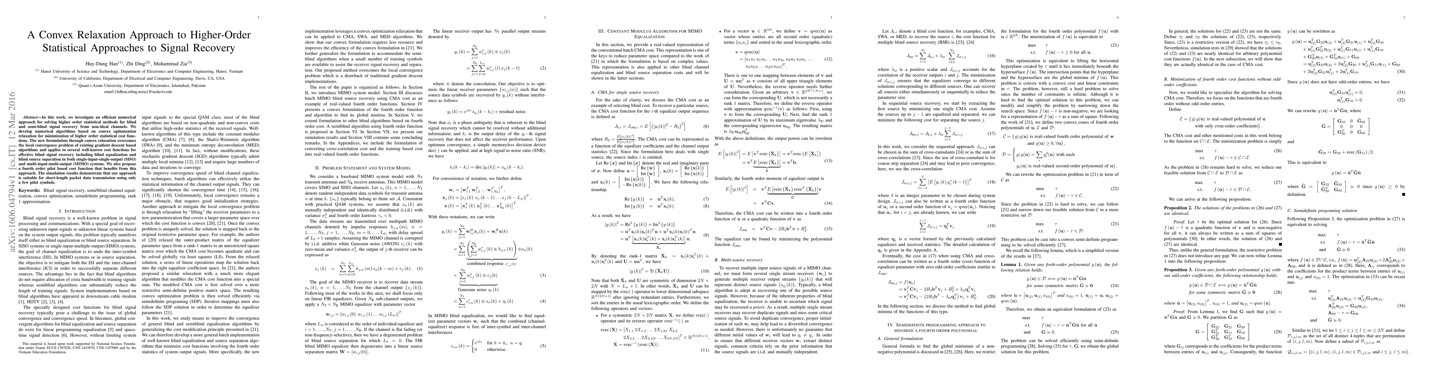This paper proposes a convex optimization relaxation method for solving higher-order statistical problems in signal recovery, addressing the local convergence issues of gradient descent algorithms. It demonstrates effective blind signal recovery in both SISO and MIMO systems, including the introduction of a fourth-order pilot-based cost function.