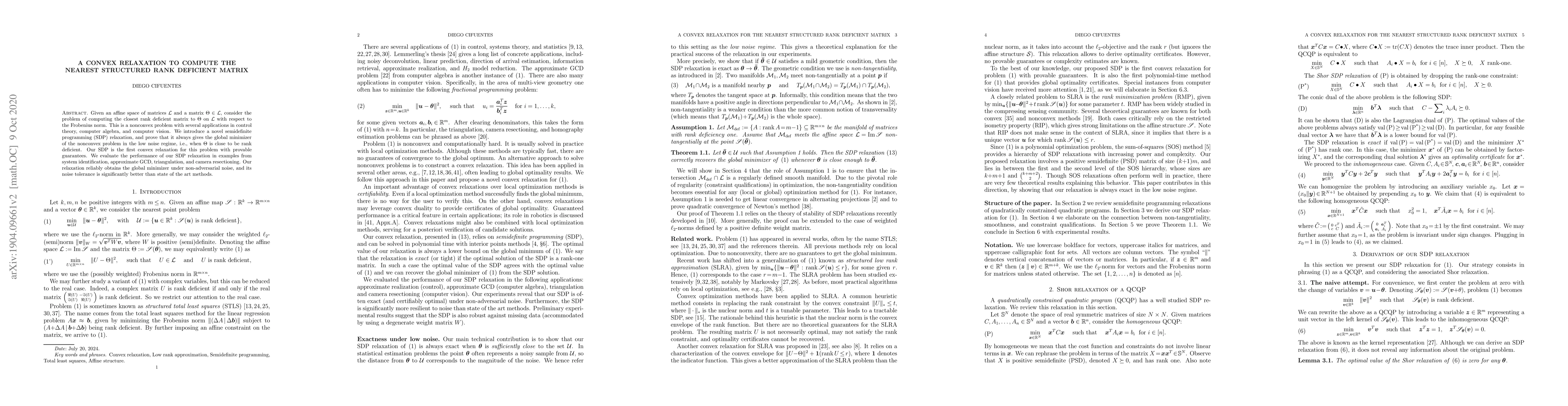 Given an affine space of matrices $\mathcal{L}$ and a matrix $\Theta\in \mathcal{L}$, consider the problem of computing the closest rank deficient matrix to $\Theta$ on $\mathcal{L}$ with respect to the Frobenius norm. This is a nonconvex problem with several applications in control theory, computer algebra, and computer vision. We introduce a novel semidefinite programming (SDP) relaxation, and prove that it always gives the global minimizer of the nonconvex problem in the low noise regime, i.e., when $\Theta$ is close to be rank deficient. Our SDP is the first convex relaxation for this problem with provable guarantees. We evaluate the performance of our SDP relaxation in examples from system identification, approximate GCD, triangulation, and camera resectioning. Our relaxation reliably obtains the global minimizer under non-adversarial noise, and its noise tolerance is significantly better than state of the art methods.