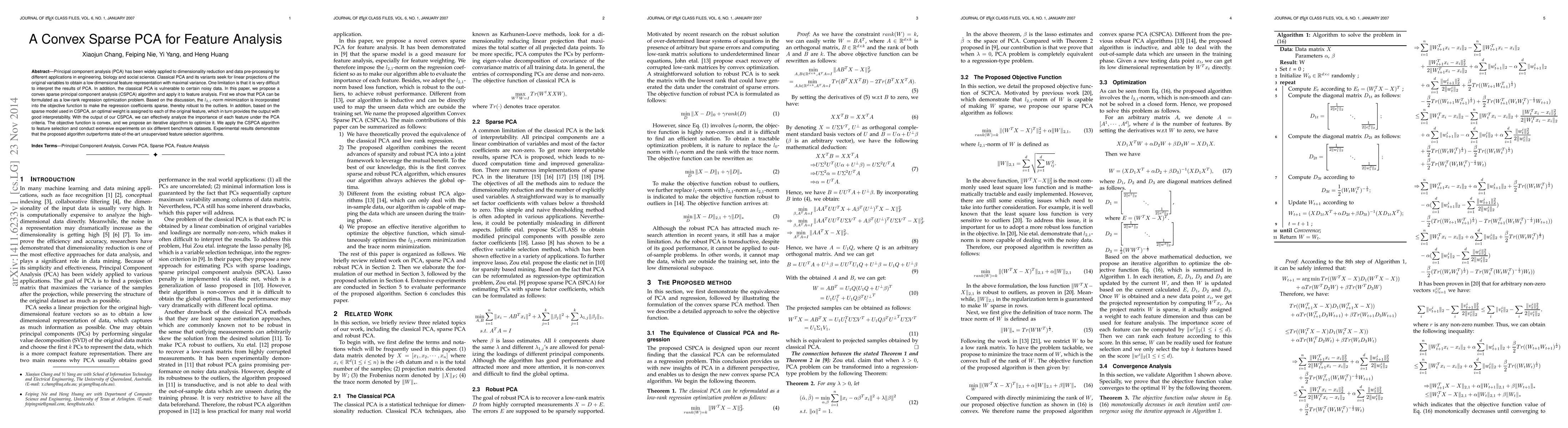 This paper proposes a convex sparse principal component analysis (CSPCA) algorithm for feature analysis, addressing the interpretability and robustness issues of classical PCA. The CSPCA incorporates l2, 1-norm minimization to achieve sparse regression coefficients, enhancing robustness to outliers and interpretability through optimal feature weighting.