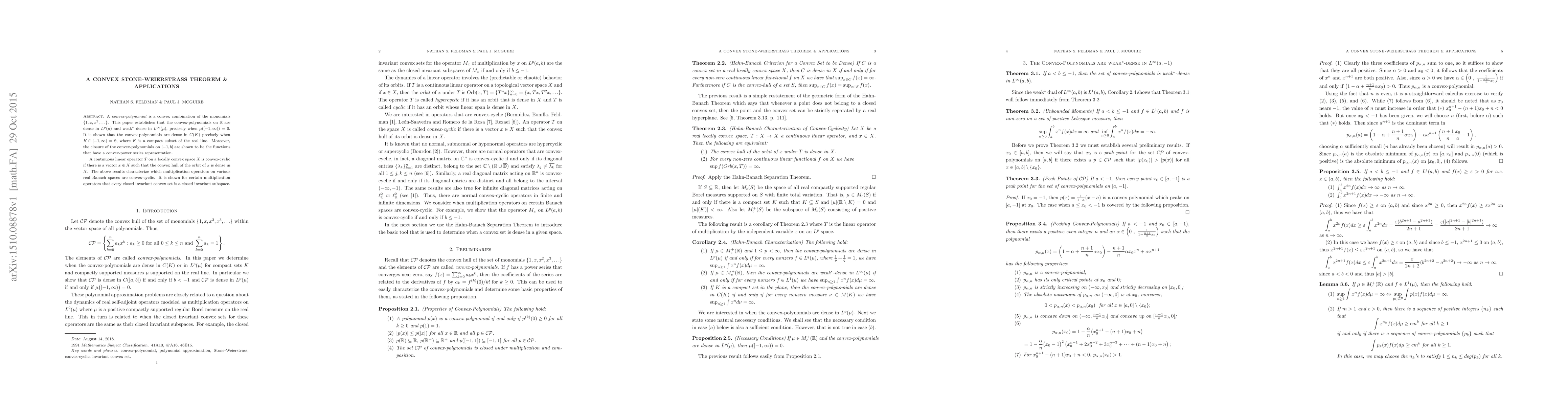A convex-polynomial is a convex combination of the monomials $\{1, x, x^2, \ldots\}$. This paper establishes that the convex-polynomials on $\mathbb R$ are dense in $L^p(\mu)$ and weak$^*$ dense in $L^\infty(\mu)$, precisely when $\mu([-1,\infty)) = 0$. It is shown that the convex-polynomials are dense in $C(K)$ precisely when $K \cap [-1, \infty) = \emptyset$, where $K$ is a compact subset of the real line. Moreover, the closure of the convex-polynomials on $[-1,b]$ are shown to be the functions that have a convex-power series representation. A continuous linear operator $T$ on a locally convex space $X$ is convex-cyclic if there is a vector $x \in X$ such that the convex hull of the orbit of $x$ is dense in $X$. The above results characterize which multiplication operators on various real Banach spaces are convex-cyclic. It is shown for certain multiplication operators that every closed invariant convex set is a closed invariant subspace.