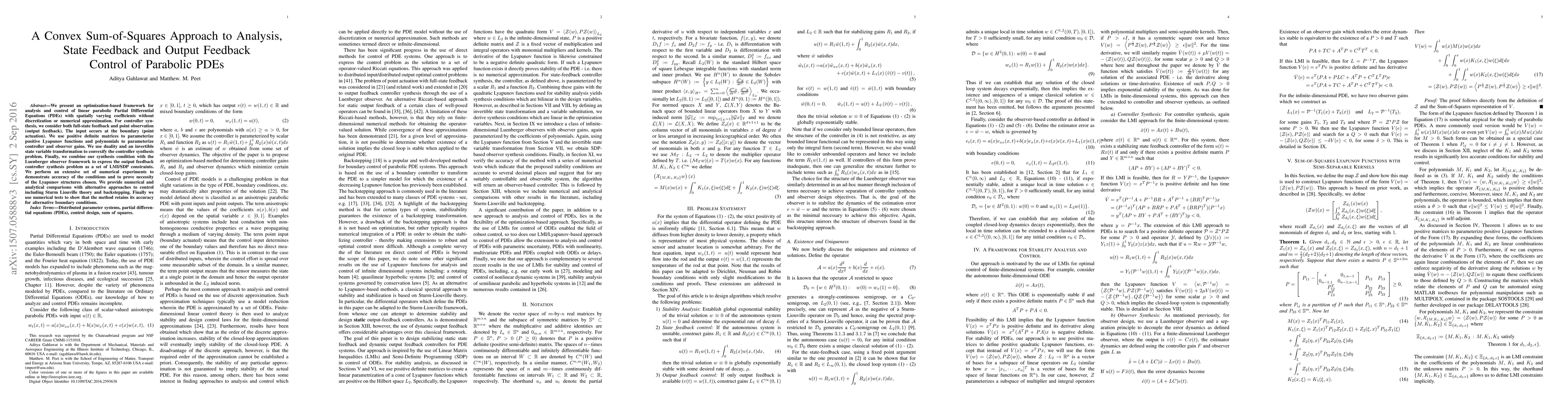 This paper proposes an optimization-based framework for analyzing and controlling linear parabolic PDEs using convex sum-of-squares techniques, achieving full-state and output feedback control without discretization. The method leverages convex optimization and LMI/SDP constraints for controller synthesis.