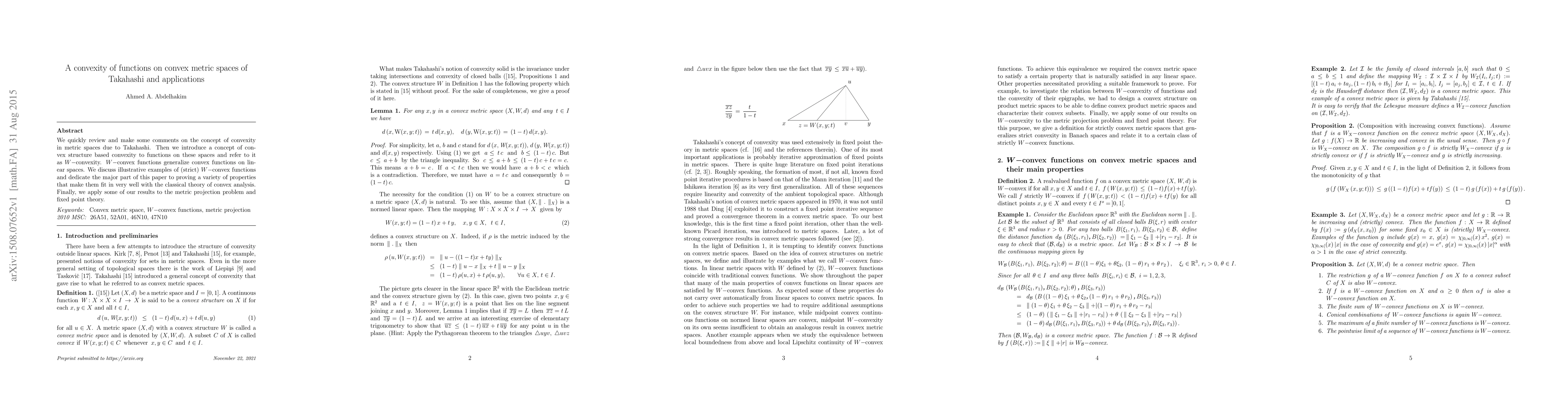 This paper introduces W-convex functions on convex metric spaces, generalizing convex functions on linear spaces, and proves various properties that align with classical theory of convex analysis, with applications to the metric projection problem and fixed point theory.