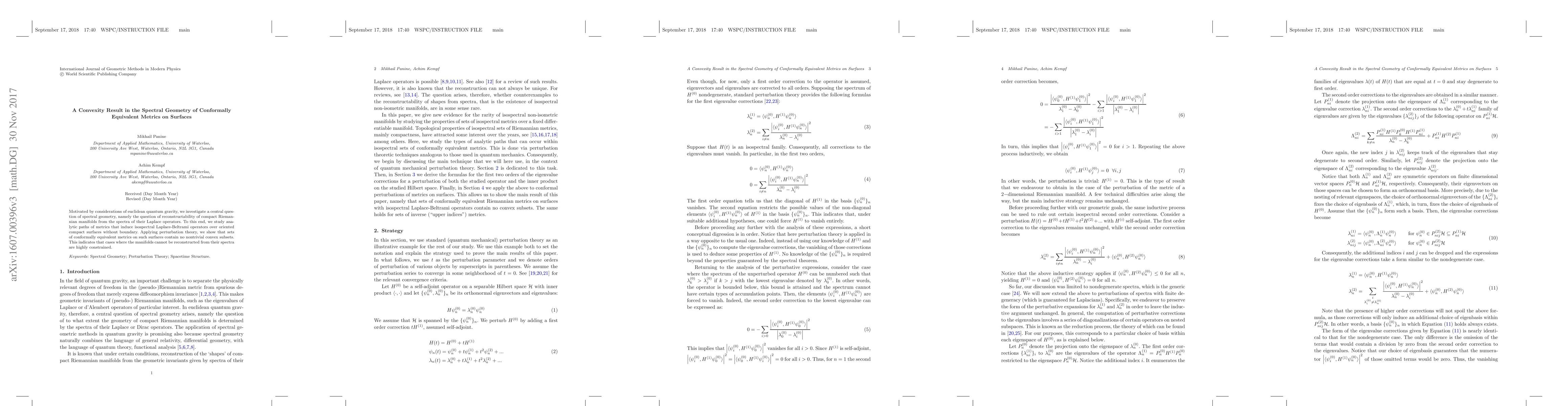 Motivated by considerations of euclidean quantum gravity, we investigate a central question of spectral geometry, namely the question of reconstructability of compact Riemannian manifolds from the spectra of their Laplace operators. To this end, we study analytic paths of metrics that induce isospectral Laplace-Beltrami operators over oriented compact surfaces without boundary. Applying perturbation theory, we show that sets of conformally equivalent metrics on such surfaces contain no nontrivial convex subsets. This indicates that cases where the manifolds cannot be reconstructed from their spectra are highly constrained.