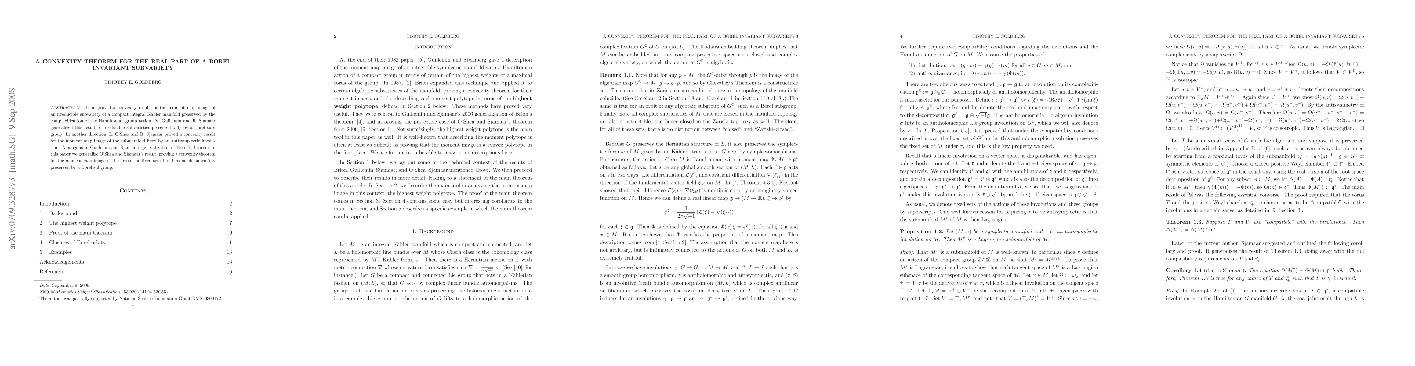 This paper generalizes previous convexity results concerning the real part of Borel invariant subvarieties in symplectic geometry, extending the findings of O'Shea and Sjamaar to irreducible subvarieties preserved by a Borel subgroup rather than just an antisymplectic involution.