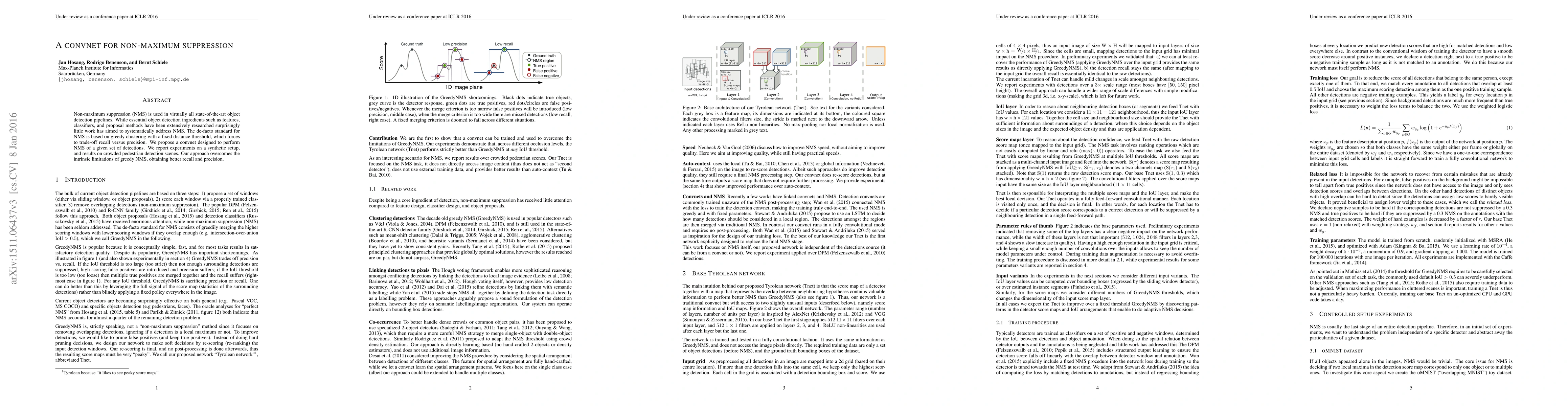This paper proposes a convolutional neural network (convnet) to perform non-maximum suppression (NMS) for object detection, aiming to improve upon the traditional greedy NMS method. The proposed convnet achieves better recall and precision compared to the standard approach, as demonstrated through experiments on pedestrian detection scenes.