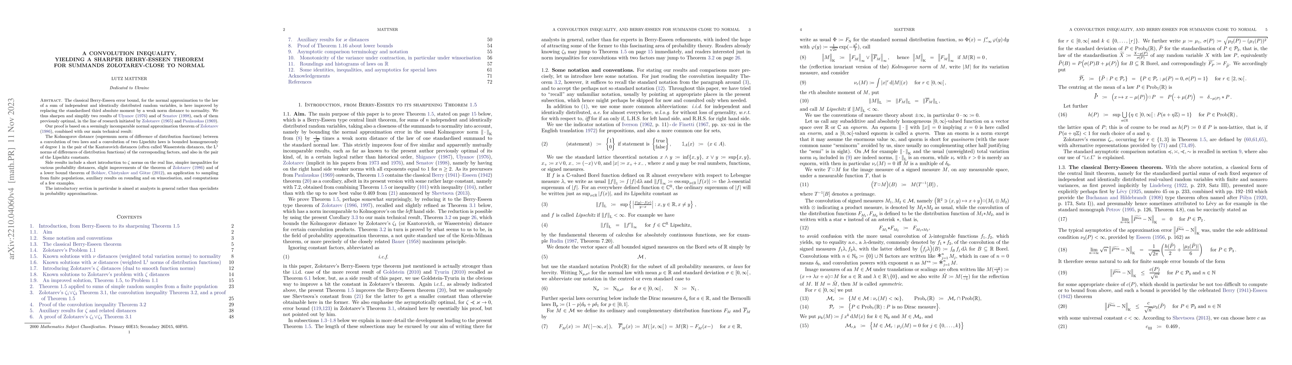 The classical Berry-Esseen error bound, for the normal approximation to the law of a sum of independent and identically distributed random variables, is here improved by replacing the standardised third absolute moment by a weak norm distance to normality. We thus sharpen and simplify two results of Ulyanov (1976) and of Senatov (1998), each of them previously optimal, in the line of research initiated by Zolotarev (1965) and Paulauskas (1969). Our proof is based on a seemingly incomparable normal approximation theorem of Zolotarev (1986), combined with our main technical result: The Kolmogorov distance (supremum norm of difference of distribution functions) between a convolution of two laws and a convolution of two Lipschitz laws is bounded homogeneously of degree 1 in the pair of the Wasserstein distances (L$^1$ norms of differences of distribution functions) of the corresponding factors, and also, inessentially for the present application, in the pair of the Lipschitz constants. Side results include a short introduction to $\zeta$ norms on the real line, simpler inequalities for various probability distances, slight improvements of the theorem of Zolotarev (1986) and of a lower bound theorem of Bobkov, Chistyakov and G\"otze (2012), an application to sampling from finite populations, auxiliary results on rounding and on winsorisation, and computations of a few examples. The introductory section in particular is aimed at analysts in general rather than specialists in probability approximations.