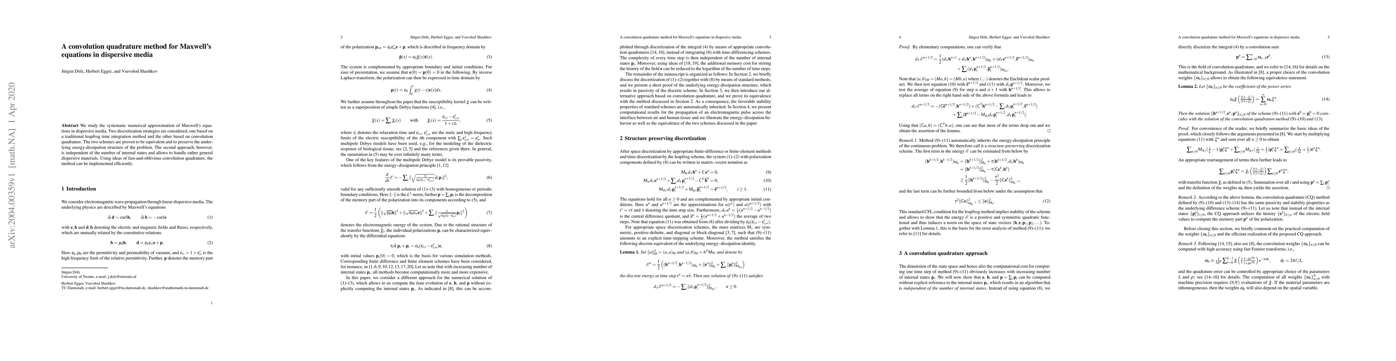 This paper proposes a convolution quadrature method for numerically solving Maxwell's equations in dispersive media, demonstrating equivalence with a traditional leapfrog method while preserving energy-dissipation properties. The convolution quadrature approach is more flexible and efficiently implementable for general dispersive materials.