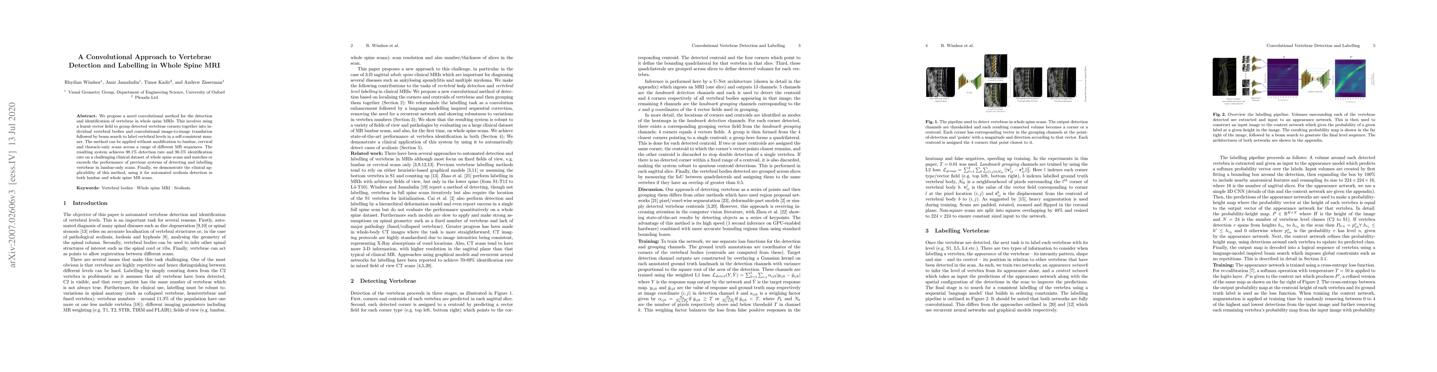 This paper introduces a convolutional neural network for detecting and labeling vertebrae in whole spine MRIs, achieving a 98.1% detection rate and 96.5% identification rate. The method uses a learnt vector field and convolutional translation for accurate vertebral labeling across different scan types.
