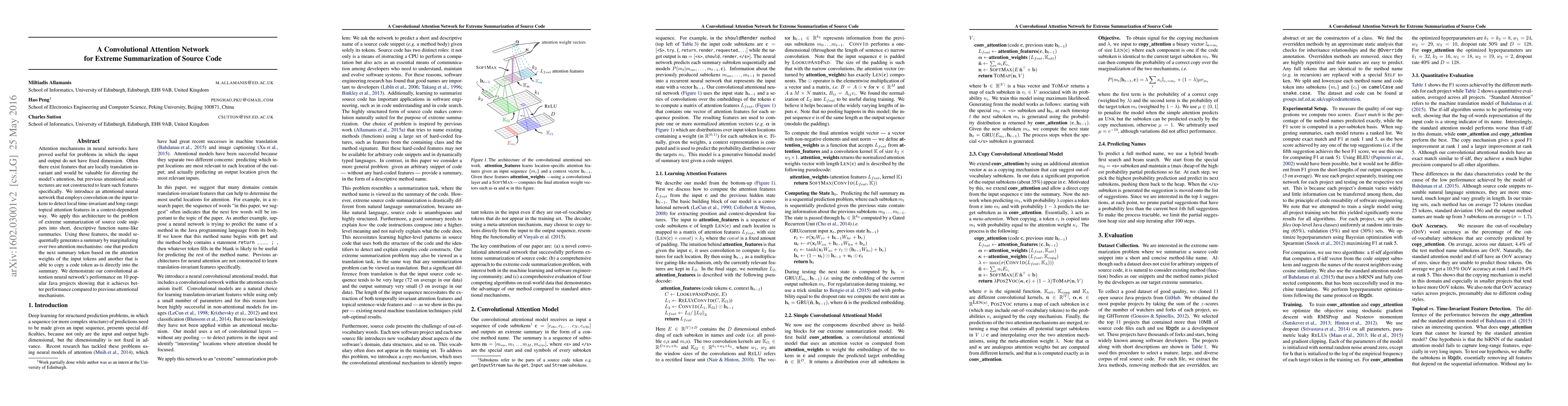 This paper introduces a convolutional attention network for extreme summarization of source code, employing convolution to detect translation-invariant features and two attention mechanisms to generate concise summaries. The model demonstrates superior performance on summarizing source code from 10 popular Java projects compared to previous methods.