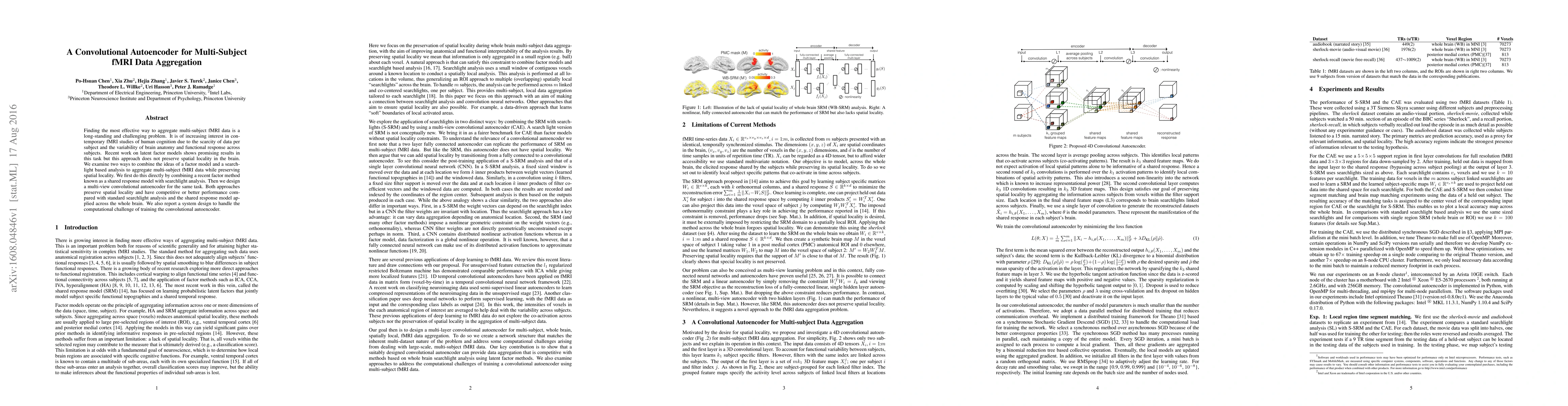 Finding the most effective way to aggregate multi-subject fMRI data is a long-standing and challenging problem. It is of increasing interest in contemporary fMRI studies of human cognition due to the scarcity of data per subject and the variability of brain anatomy and functional response across subjects. Recent work on latent factor models shows promising results in this task but this approach does not preserve spatial locality in the brain. We examine two ways to combine the ideas of a factor model and a searchlight based analysis to aggregate multi-subject fMRI data while preserving spatial locality. We first do this directly by combining a recent factor method known as a shared response model with searchlight analysis. Then we design a multi-view convolutional autoencoder for the same task. Both approaches preserve spatial locality and have competitive or better performance compared with standard searchlight analysis and the shared response model applied across the whole brain. We also report a system design to handle the computational challenge of training the convolutional autoencoder.
