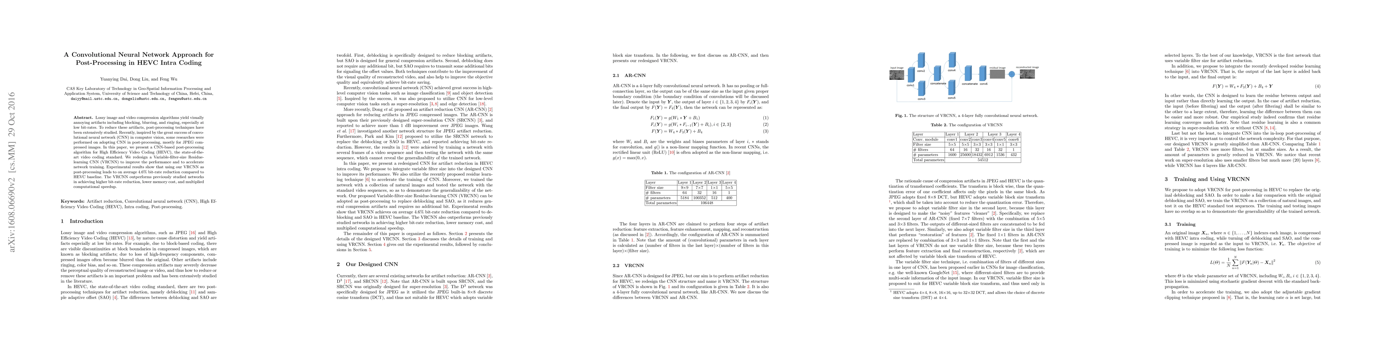 This paper proposes a CNN-based post-processing algorithm for HEVC intra coding to reduce compression artifacts, introducing a Variable-filter-size Residue-learning CNN (VRCNN) that achieves an average 4.6% bit-rate reduction compared to the HEVC baseline. The VRCNN demonstrates superior performance in bit-rate reduction, lower memory cost, and computational efficiency.
