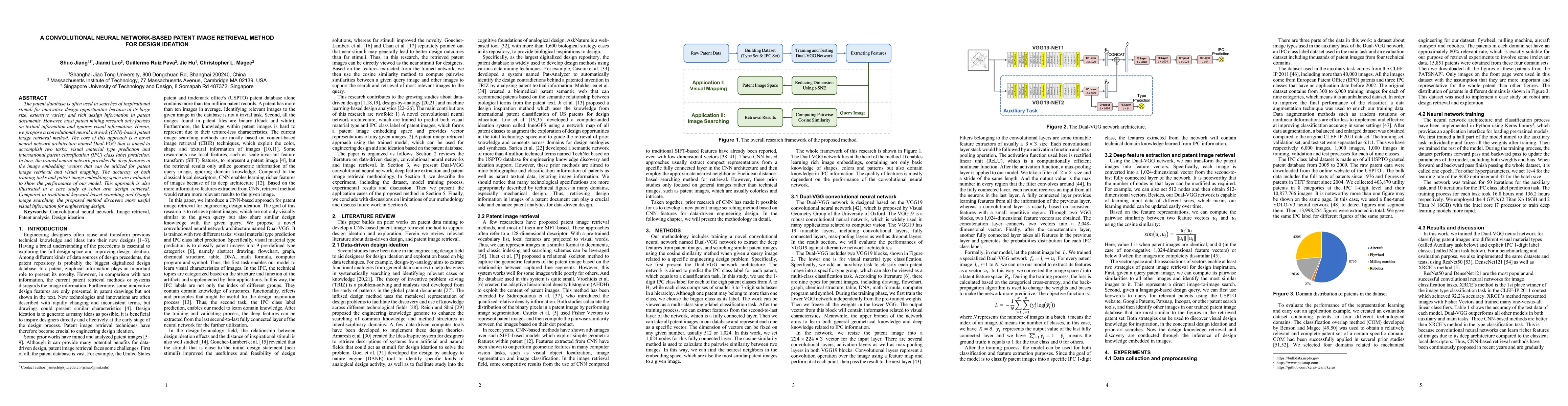 This paper proposes a CNN-based patent image retrieval method using Dual-VGG architecture for visual material type and IPC class prediction, enabling effective patent image retrieval and visual mapping. The method outperforms traditional keyword-based searches by discovering more useful visual information for design ideation.
