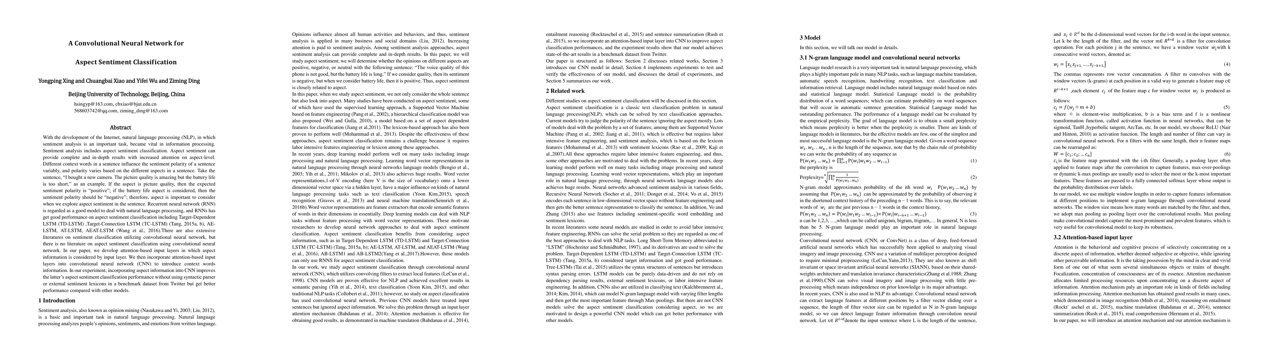This paper proposes a convolutional neural network (CNN) with attention-based input layers for aspect sentiment classification, demonstrating improved performance over other models on a Twitter dataset without requiring syntactic parsers or external sentiment lexicons.