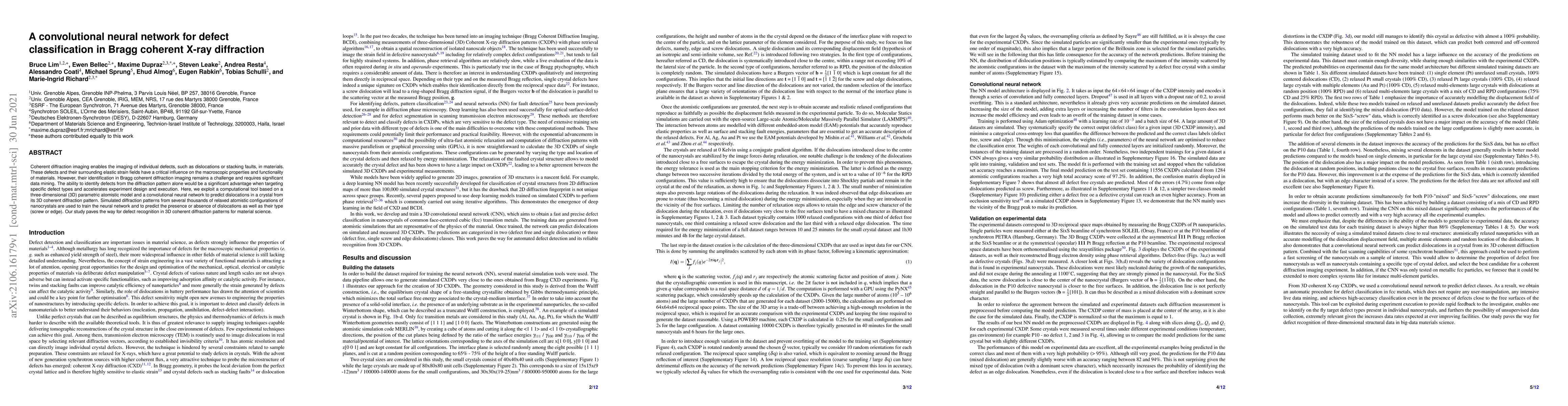 This paper proposes a convolutional neural network to classify defects, such as dislocations, in Bragg coherent X-ray diffraction patterns. The trained network can predict dislocations and their types from simulated diffraction patterns, aiding in material science's defect identification process.
