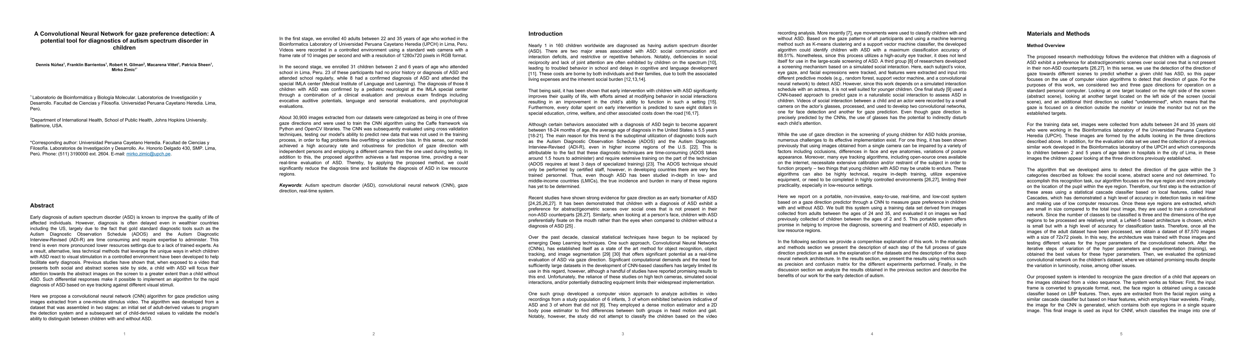 This research proposes a convolutional neural network (CNN) algorithm to detect gaze preference, aiming to facilitate early diagnosis of autism spectrum disorder (ASD) in children. The method uses eye tracking during exposure to visual stimuli, showing promise for reducing diagnosis time and aiding in regions with limited resources.