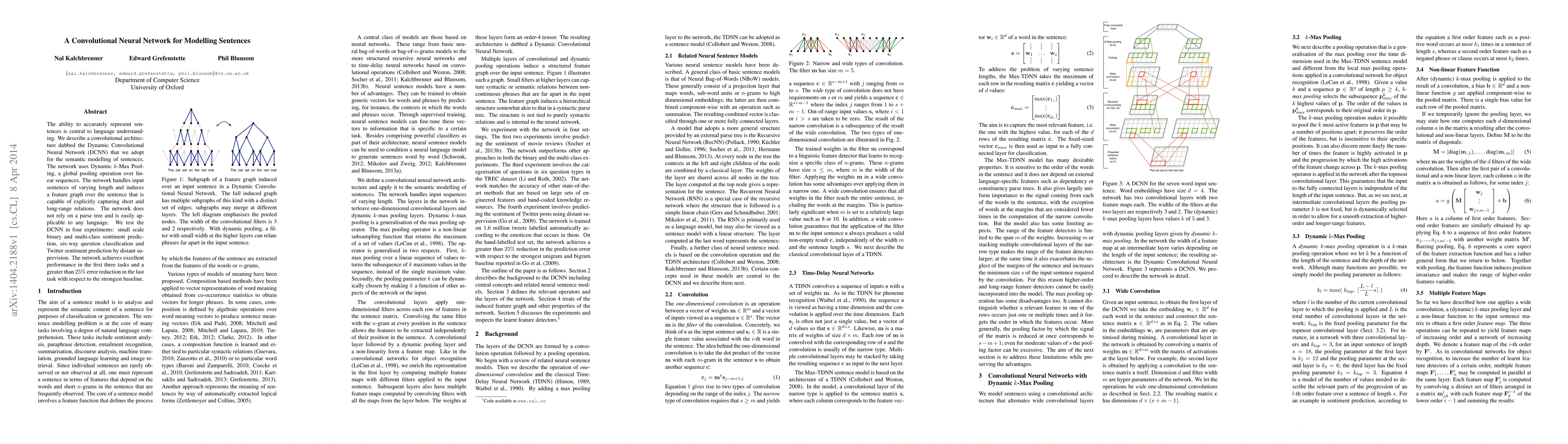 The ability to accurately represent sentences is central to language understanding. We describe a convolutional architecture dubbed the Dynamic Convolutional Neural Network (DCNN) that we adopt for the semantic modelling of sentences. The network uses Dynamic k-Max Pooling, a global pooling operation over linear sequences. The network handles input sentences of varying length and induces a feature graph over the sentence that is capable of explicitly capturing short and long-range relations. The network does not rely on a parse tree and is easily applicable to any language. We test the DCNN in four experiments: small scale binary and multi-class sentiment prediction, six-way question classification and Twitter sentiment prediction by distant supervision. The network achieves excellent performance in the first three tasks and a greater than 25% error reduction in the last task with respect to the strongest baseline.
