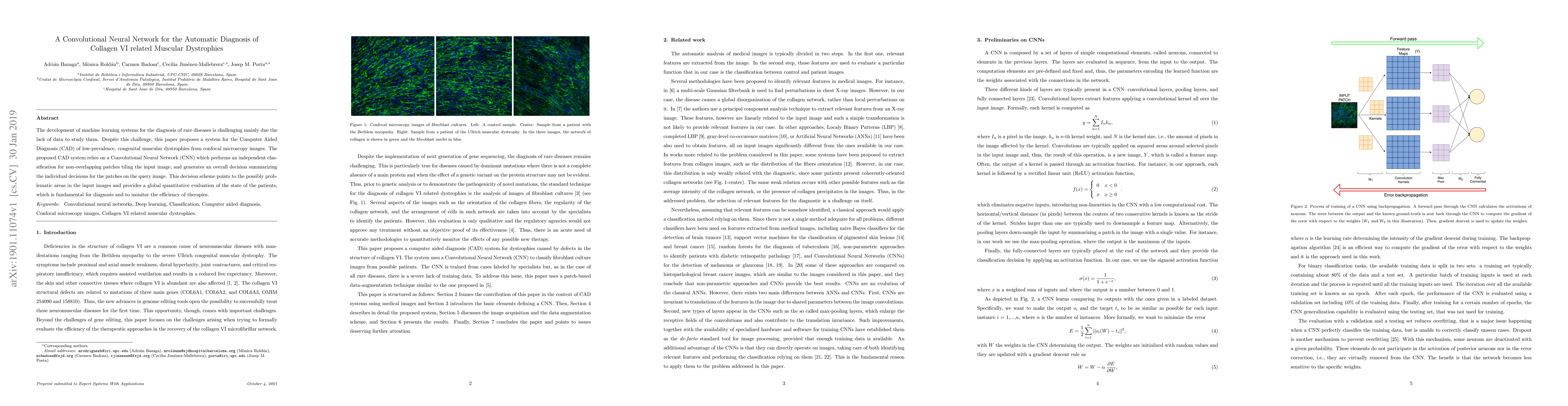 The development of machine learning systems for the diagnosis of rare diseases is challenging mainly due the lack of data to study them. Despite this challenge, this paper proposes a system for the Computer Aided Diagnosis (CAD) of low-prevalence, congenital muscular dystrophies from confocal microscopy images. The proposed CAD system relies on a Convolutional Neural Network (CNN) which performs an independent classification for non-overlapping patches tiling the input image, and generates an overall decision summarizing the individual decisions for the patches on the query image. This decision scheme points to the possibly problematic areas in the input images and provides a global quantitative evaluation of the state of the patients, which is fundamental for diagnosis and to monitor the efficiency of therapies.