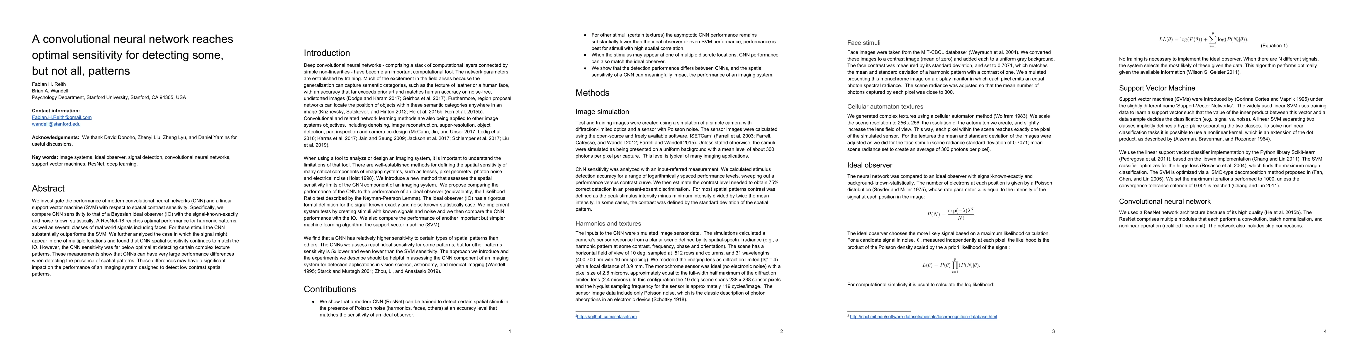 We investigate the performance of modern convolutional neural networks (CNN) and a linear support vector machine (SVM) with respect to spatial contrast sensitivity. Specifically, we compare CNN sensitivity to that of a Bayesian ideal observer (IO) with the signal-known-exactly and noise known statistically. A ResNet-18 reaches optimal performance for harmonic patterns, as well as several classes of real world signals including faces. For these stimuli the CNN substantially outperforms the SVM. We further analyzed the case in which the signal might appear in one of multiple locations and found that CNN spatial sensitivity continues to match the IO. However, the CNN sensitivity was far below optimal at detecting certain complex texture patterns. These measurements show that CNNs can have very large performance differences when detecting the presence of spatial patterns. These differences may have a significant impact on the performance of an imaging system designed to detect low contrast spatial patterns.