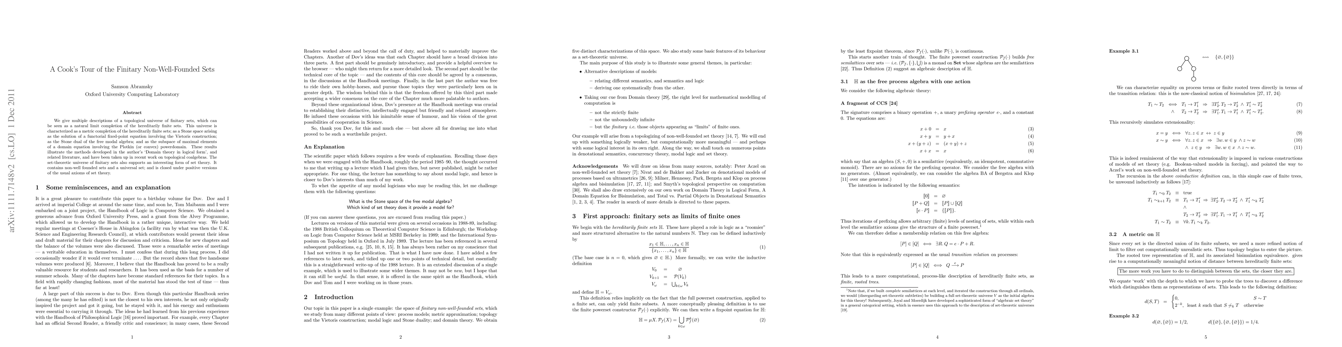 We give multiple descriptions of a topological universe of finitary sets, which can be seen as a natural limit completion of the hereditarily finite sets. This universe is characterized as a metric completion of the hereditarily finite sets; as a Stone space arising as the solution of a functorial fixed-point equation involving the Vietoris construction; as the Stone dual of the free modal algebra; and as the subspace of maximal elements of a domain equation involving the Plotkin (or convex) powerdomain. These results illustrate the methods developed in the author's 'Domain theory in logical form', and related literature, and have been taken up in recent work on topological coalgebras. The set-theoretic universe of finitary sets also supports an interesting form of set theory. It contains non-well founded sets and a universal set; and is closed under positive versions of the usual axioms of set theory.