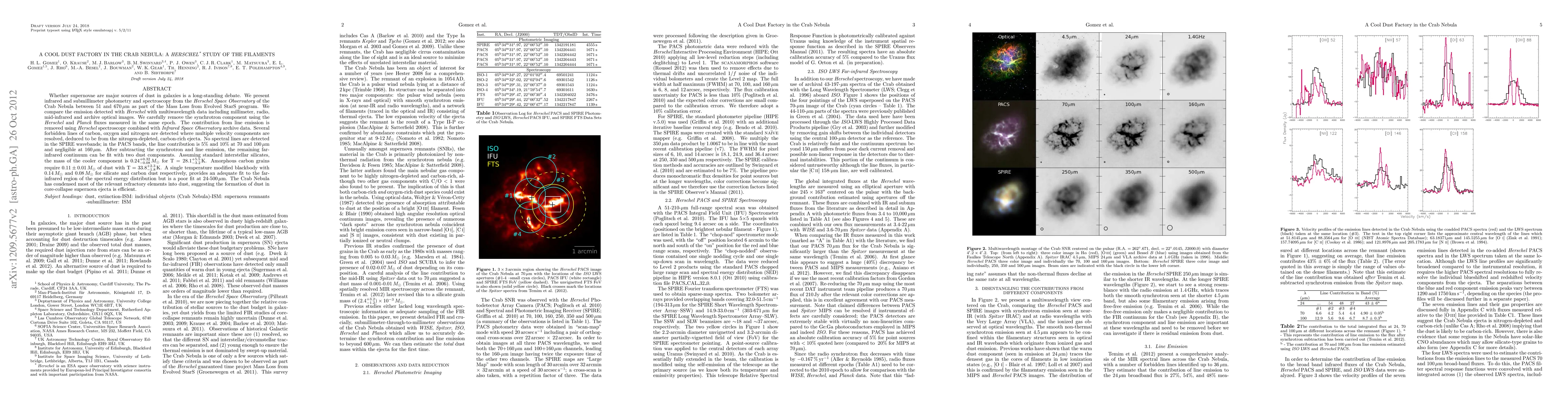 Whether supernovae are major sources of dust in galaxies is a long-standing debate. We present infrared and submillimeter photometry and spectroscopy from the Herschel Space Observatory of the Crab Nebula between 51 and 670 micron as part of the Mass Loss from Evolved StarS program. We compare the emission detected with Herschel with multiwavelength data including millimeter, radio, mid-infrared and archive optical images. We carefully remove the synchrotron component using the Herschel and Planck fluxes measured in the same epoch. The contribution from line emission is removed using Herschel spectroscopy combined with Infrared Space Observatory archive data. Several forbidden lines of carbon, oxygen and nitrogen are detected where multiple velocity components are resolved, deduced to be from the nitrogen-depleted, carbon-rich ejecta. No spectral lines are detected in the SPIRE wavebands; in the PACS bands, the line contribution is 5% and 10% at 70 and 100 micron and negligible at 160 micron. After subtracting the synchrotron and line emission, the remaining far-infrared continuum can be fit with two dust components. Assuming standard interstellar silicates, the mass of the cooler component is 0.24(+0.32)(-0.08) Msolar for T = 28.1(+5.5)(-3.2)K. Amorphous carbon grains require 0.11 +/- 0.01 Msolar of dust with T = 33.8(+2.3)(-1.8) K. A single temperature modified-blackbody with 0.14Msolar and 0.08Msolar for silicate and carbon dust respectively, provides an adequate fit to the far- infrared region of the spectral energy distribution but is a poor fit at 24-500 micron. The Crab Nebula has condensed most of the relevant refractory elements into dust, suggesting the formation of dust in core-collapse supernova ejecta is efficient.