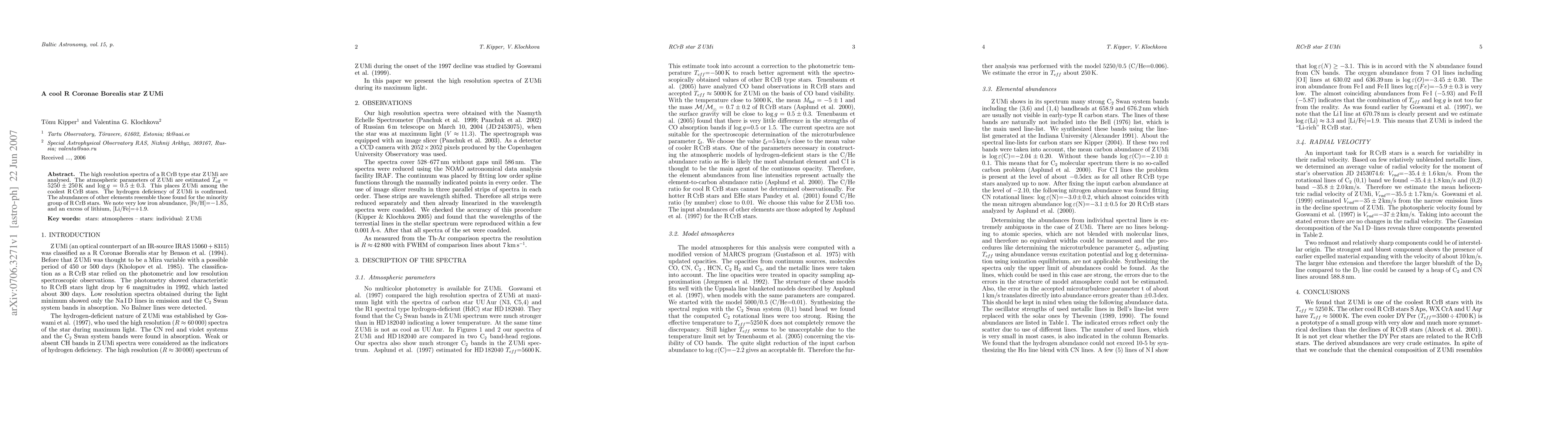 Researchers analyzed a R CrB star, Z UMi, finding it to be one of the coolest in its class with low iron abundance and high lithium levels.