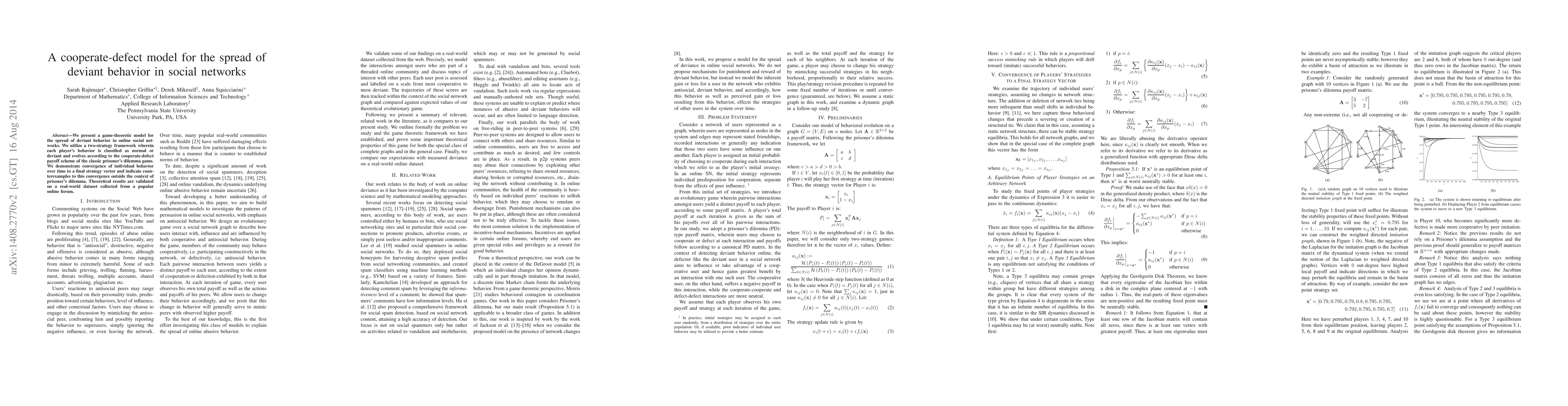 This paper introduces a game-theoretic model to study the spread of deviant behavior in social networks using a two-strategy framework based on the prisoner's dilemma. The model demonstrates convergence of individual behavior over time and validates theoretical results with real-world data from an online forum.