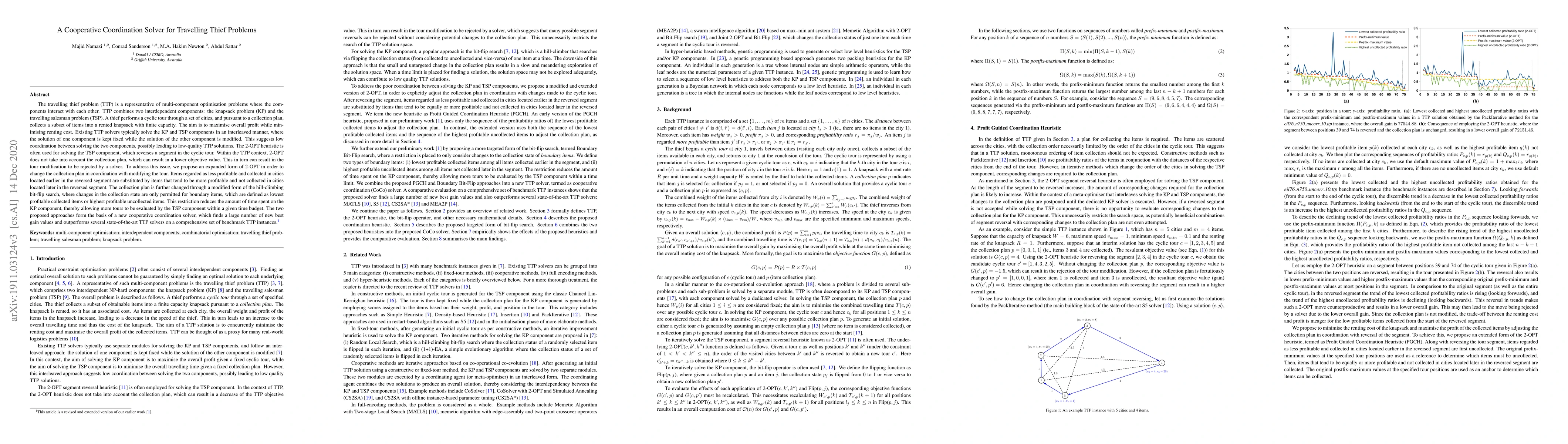 The research introduces a cooperative coordination solver for the Travelling Thief Problem (TTP), which combines the Knapsack Problem (KP) and Travelling Salesman Problem (TSP). The proposed method enhances the 2-OPT heuristic used for TSP by coordinating collection plan modifications, improving overall TTP solution quality. This approach outperforms existing TTP solvers by optimizing both components cooperatively, reducing KP resolution time, and increasing evaluated TSP tours within a time budget.