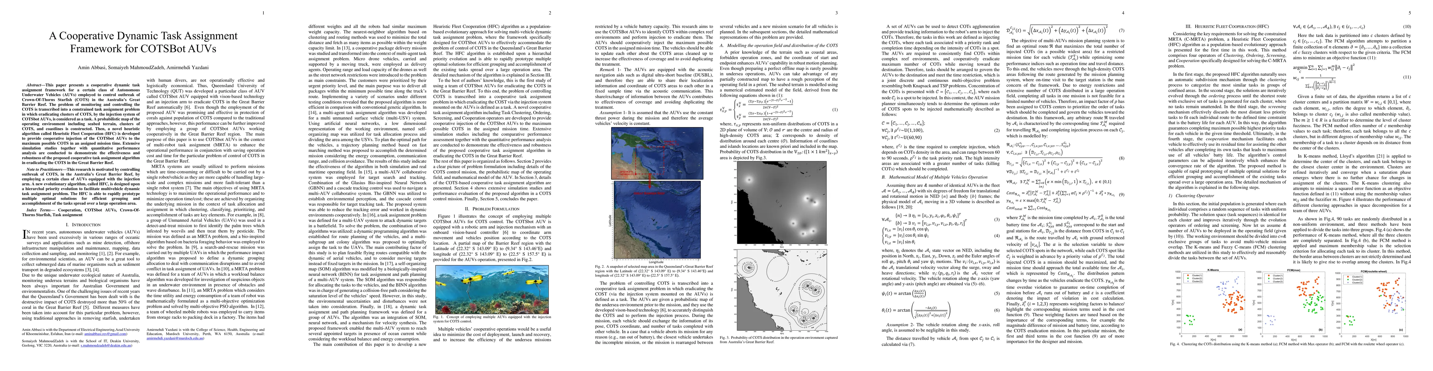 This paper presents a cooperative dynamic task assignment framework for a certain class of Autonomous Underwater Vehicles (AUVs) employed to control outbreak of Crown-Of-Thorns Starfish (COTS) in Australia's Great Barrier Reef. The problem of monitoring and controlling the COTS is transcribed into a constrained task assignment problem in which eradicating clusters of COTS, by the injection system of COTSbot AUVs, is considered as a task. A probabilistic map of the operating environment including seabed terrain, clusters of COTS, and coastlines is constructed. Then, a novel heuristic algorithm called Heuristic Fleet Cooperation (HFC) is developed to provide a cooperative injection of the COTSbot AUVs to the maximum possible COTS in an assigned mission time. Extensive simulation studies together with quantitative performance analysis are conducted to demonstrate the effectiveness and robustness of the proposed cooperative task assignment algorithm in eradicating the COTS in the Great Barrier Reef.