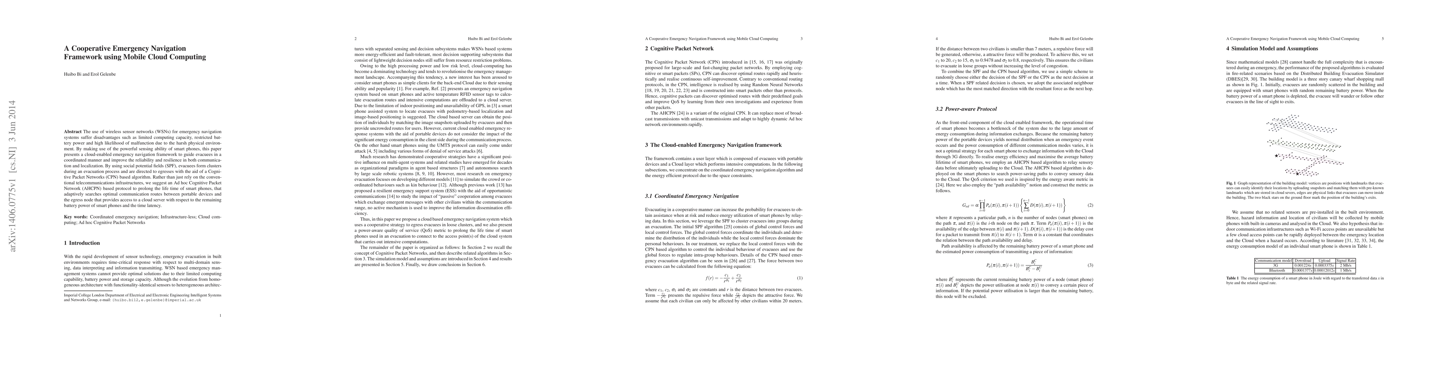 This paper proposes a cooperative emergency navigation framework leveraging mobile cloud computing to enhance evacuation guidance. It utilizes smartphones' sensing capabilities and a Cognitive Packet Network-based algorithm to guide evacuees in clusters, improving communication and localization reliability.