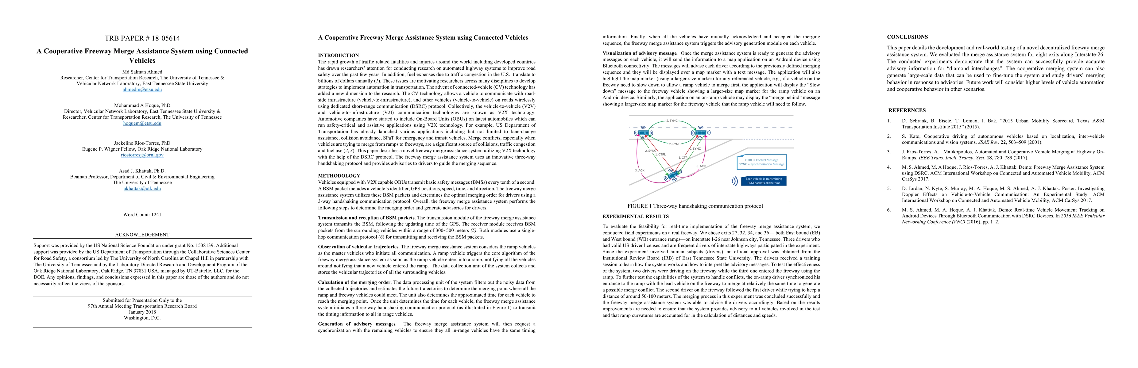 This paper proposes a cooperative freeway merge assistance system leveraging connected vehicle (CV) technology to enhance road safety and reduce congestion. It utilizes V2X communication protocols, including a novel three-way handshaking protocol, to provide real-time advisories to drivers during merge operations.