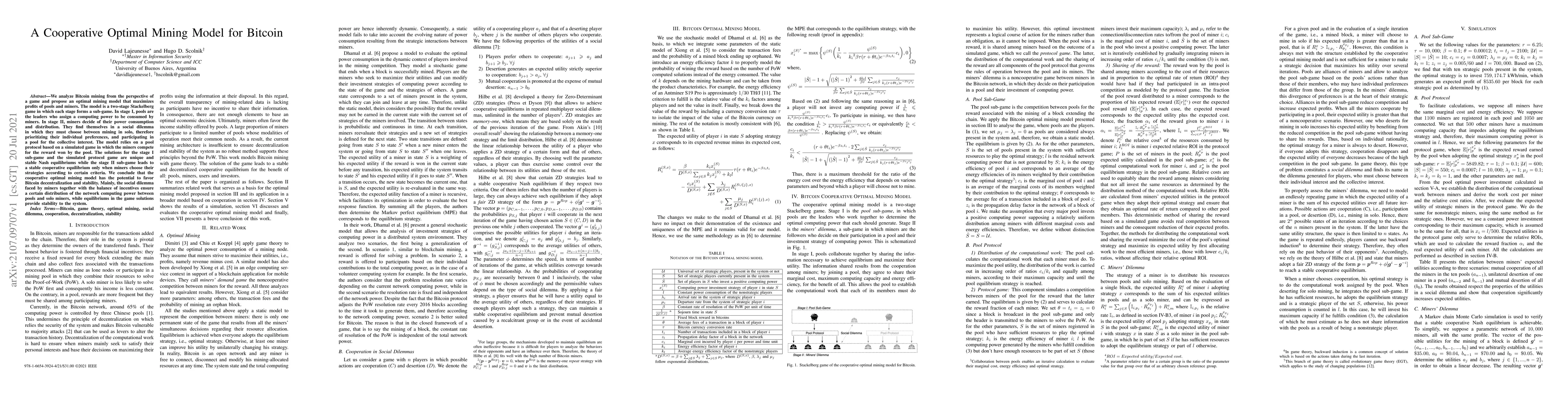 We analyze Bitcoin mining from the perspective of a game and propose an optimal mining model that maximizes profits of pools and miners. The model is a two-stage Stackelberg game in which each stage forms a sub-game. In stage I, pools are the leaders who assign a computing power to be consumed by miners. In stage II, miners decide of their power consumption and distribution. They find themselves in a social dilemma in which they must choose between mining in solo, therefore prioritizing their individual preferences, and participating in a pool for the collective interest. The model relies on a pool protocol based on a simulated game in which the miners compete for the reward won by the pool. The solutions for the stage I sub-game and the simulated protocol game are unique and stable Nash equilibriums while the stage II sub-game leads to a stable cooperative equilibrium only when miners choose their strategies according to certain criteria. We conclude that the cooperative optimal mining model has the potential to favor Bitcoin decentralization and stability. Mainly, the social dilemma faced by miners together with the balance of incentives ensure a certain distribution of the network computing power between pools and solo miners, while equilibriums in the game solutions provide stability to the system.