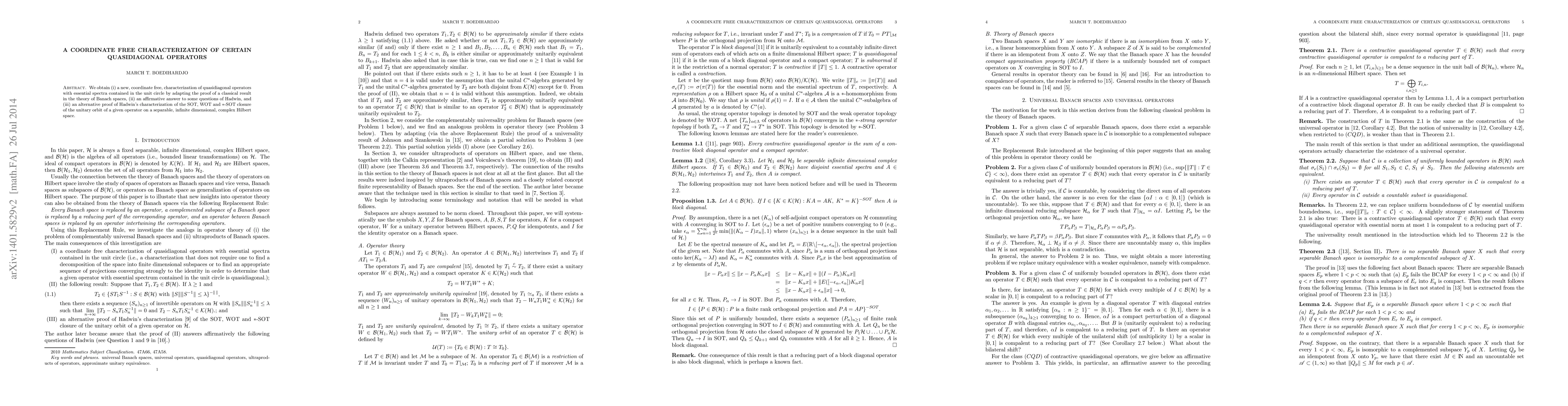 We obtain (i) a new, coordinate free, characterization of quasidiagonal operators with essential spectra contained in the unit circle by adapting the proof of a classical result in the theory of Banach spaces, (ii) an affirmative answer to some questions of Hadwin, and (iii) an alternative proof of Hadwin's characterization of the SOT, WOT and $*$-SOT closure of the unitary orbit of a given operator on a separable, infinite dimensional, complex Hilbert space.