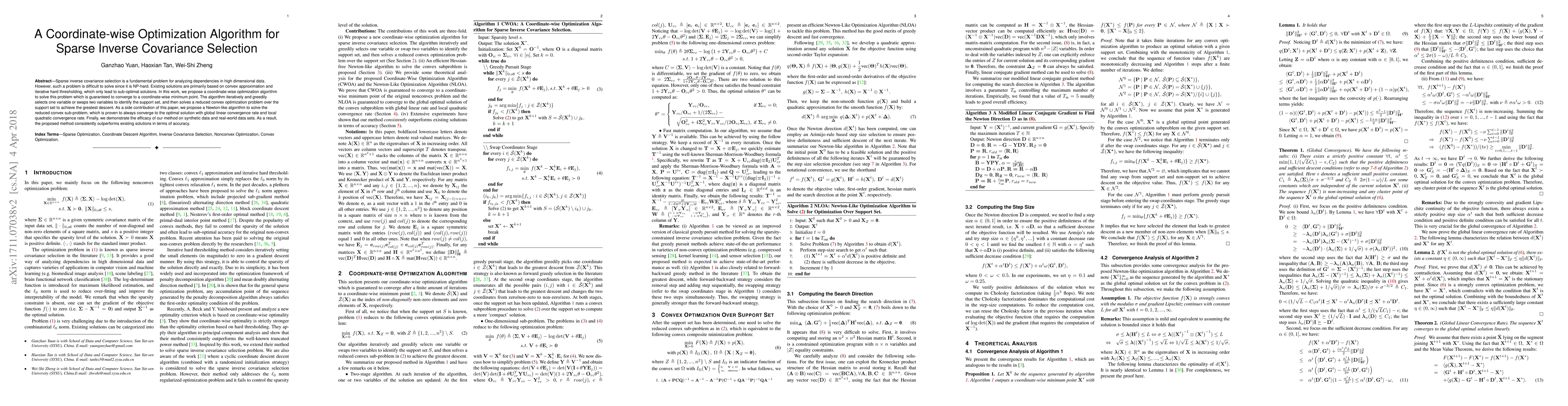 This paper proposes a coordinate-wise optimization algorithm for sparse inverse covariance selection, which guarantees convergence to a coordinate-wise minimum. It iteratively selects or swaps variables to identify the support set and solves a reduced convex optimization problem, outperforming existing sub-optimal methods.