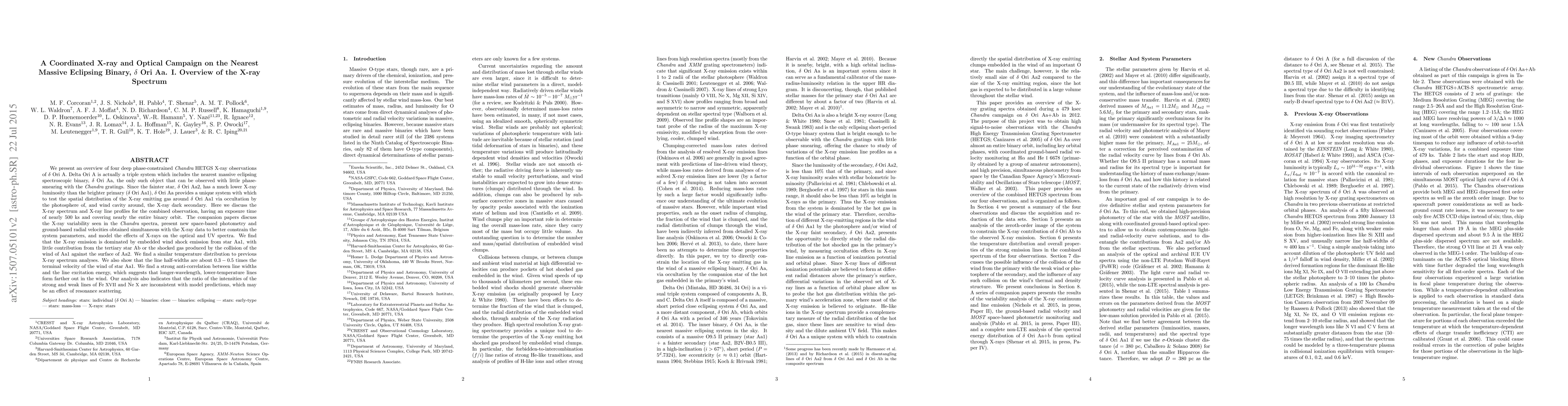 We present an overview of four phase-constrained Chandra HETGS X-ray observations of Delta Ori A. Delta Ori A is actually a triple system which includes the nearest massive eclipsing spectroscopic binary, Delta Ori Aa, the only such object which can be observed with little phase-smearing with the Chandra gratings. Since the fainter star, Delta Ori Aa2, has a much lower X-ray luminosity than the brighter primary, Delta Ori A provides a unique system with which to test the spatial distribution of the X-ray emitting gas around Delta Ori Aa1 via occultation by the photosphere of and wind cavity around the X-ray dark secondary. Here we discuss the X-ray spectrum and X-ray line profiles for the combined observation, having an exposure time of nearly 500 ksec and covering nearly the entire binary orbit. Companion papers discuss the X-ray variability seen in the Chandra spectra, present new space-based photometry and ground-based radial velocities simultaneous with the X-ray data to better constrain the system parameters, and model the effects of X-rays on the optical and UV spectrum. We find that the X-ray emission is dominated by embedded wind shock emission from star Aa1, with little contribution from the tertiary star Ab or the shocked gas produced by the collision of the wind of Aa1 against the surface of Aa2. We find a similar temperature distribution to previous X-ray spectrum analyses. We also show that the line half-widths are about $0.3-0.5\times$ the terminal velocity of the wind of star Aa1. We find a strong anti-correlation between line widths and the line excitation energy, which suggests that longer-wavelength, lower-temperature lines form farther out in the wind. Our analysis also indicates that the ratio of the intensities of the strong and weak lines of \ion{Fe}{17} and \ion{Ne}{10} are inconsistent with model predictions, which may be an effect of resonance scattering