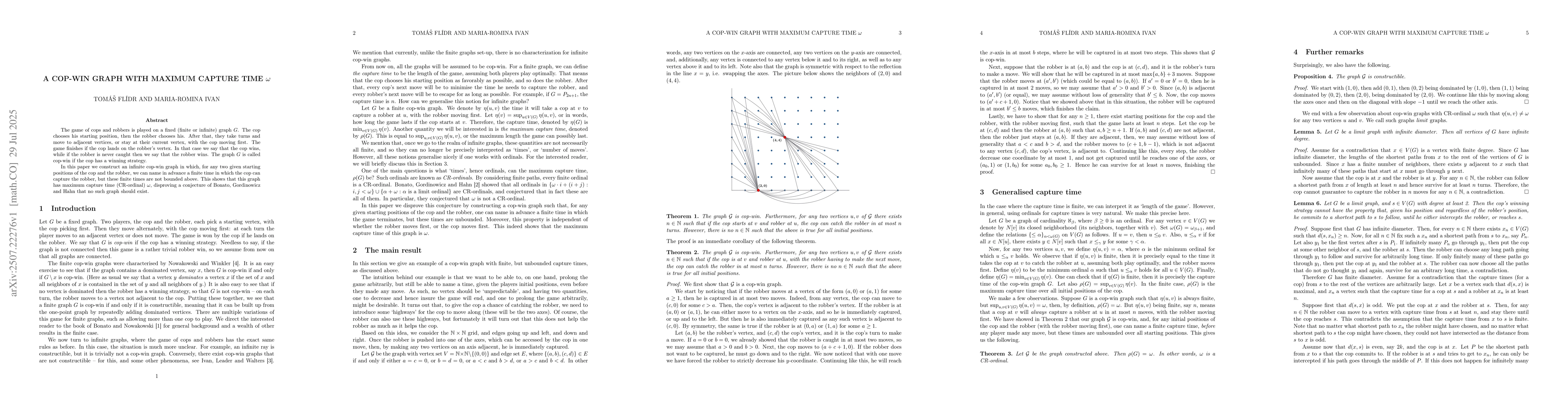The game of cops and robbers is played on a fixed (finite or infinite) graph $G$. The cop chooses his starting position, then the robber chooses his. After that, they take turns and move to adjacent vertices, or stay at their current vertex, with the cop moving first. The game finishes if the cop lands on the robber's vertex. In that case we say that the cop wins, while if the robber is never caught then we say that the robber wins. The graph $G$ is called cop-win if the cop has a winning strategy. In this paper we construct an infinite cop-win graph in which, for any two given starting positions of the cop and the robber, we can name in advance a finite time in which the cop can capture the robber, but these finite times are not bounded above. This shows that this graph has maximum capture time (CR-ordinal) $\omega$, disproving a conjecture of Bonato, Gordinowicz and Hahn that no such graph should exist.