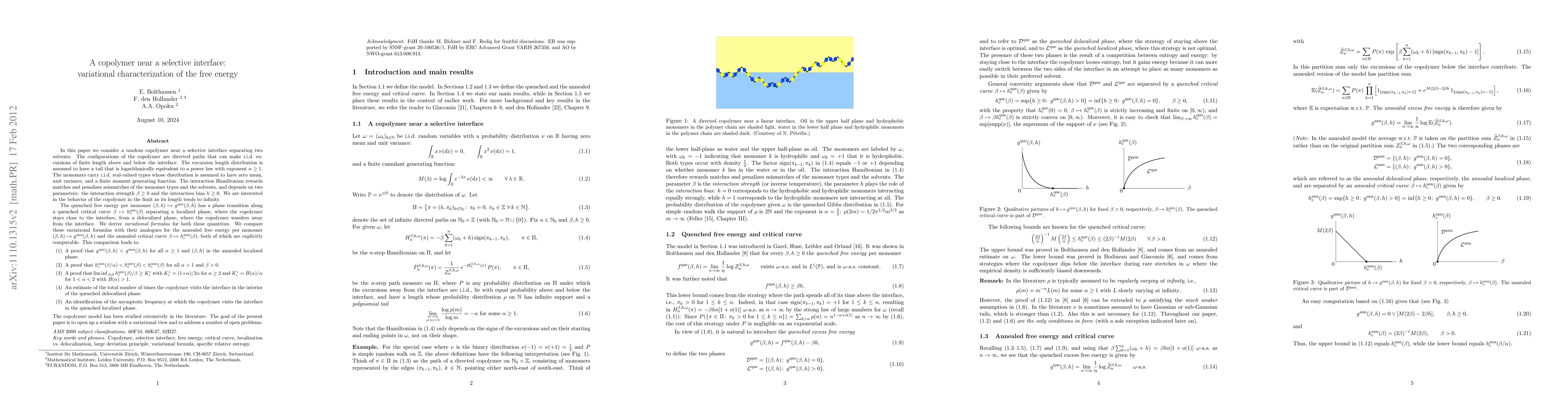This paper investigates the free energy of a two-dimensional copolymer near a selective interface between oil and water, revealing a phase transition between localized and delocalized configurations. It derives a variational expression for the quenched excess free energy and compares it to the annealed excess free energy, showing that the quenched free energy is always lower in the localized phase.