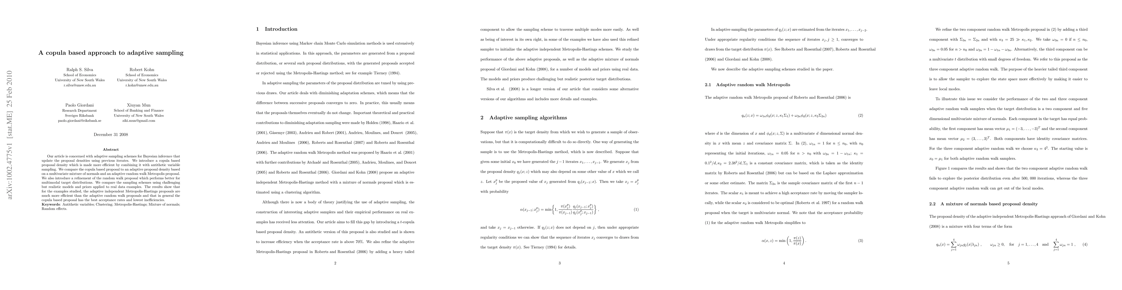 This paper proposes a copula-based adaptive sampling scheme for Bayesian inference, combining it with antithetic variable sampling to enhance efficiency. The method is compared against adaptive random walk and multivariate mixture of normals proposals, showing superior performance in terms of acceptance rates and efficiency, especially for multimodal distributions.