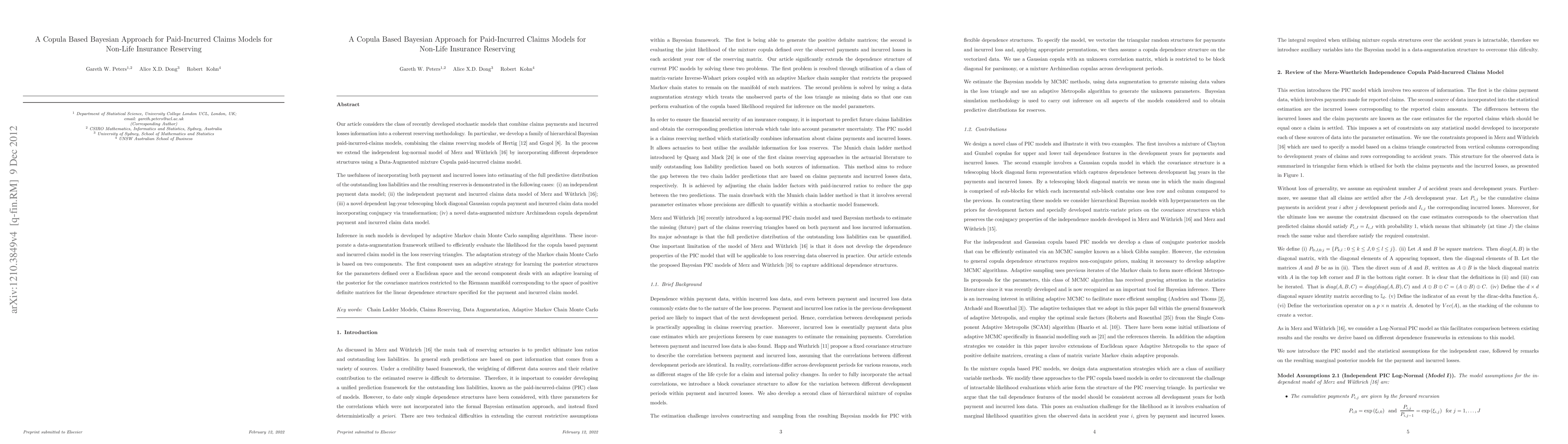 Our article considers the class of recently developed stochastic models that combine claims payments and incurred losses information into a coherent reserving methodology. In particular, we develop a family of Heirarchical Bayesian Paid-Incurred-Claims models, combining the claims reserving models of Hertig et al. (1985) and Gogol et al. (1993). In the process we extend the independent log-normal model of Merz et al. (2010) by incorporating different dependence structures using a Data-Augmented mixture Copula Paid-Incurred claims model. The utility and influence of incorporating both payment and incurred losses into estimating of the full predictive distribution of the outstanding loss liabilities and the resulting reserves is demonstrated in the following cases: (i) an independent payment (P) data model; (ii) the independent Payment-Incurred Claims (PIC) data model of Merz et al. (2010); (iii) a novel dependent lag-year telescoping block diagonal Gaussian Copula PIC data model incorporating conjugacy via transformation; (iv) a novel data-augmented mixture Archimedean copula dependent PIC data model. Inference in such models is developed via a class of adaptive Markov chain Monte Carlo sampling algorithms. These incorporate a data-augmentation framework utilized to efficiently evaluate the likelihood for the copula based PIC model in the loss reserving triangles. The adaptation strategy is based on representing a positive definite covariance matrix by the exponential of a symmetric matrix as proposed by Leonard et al. (1992).