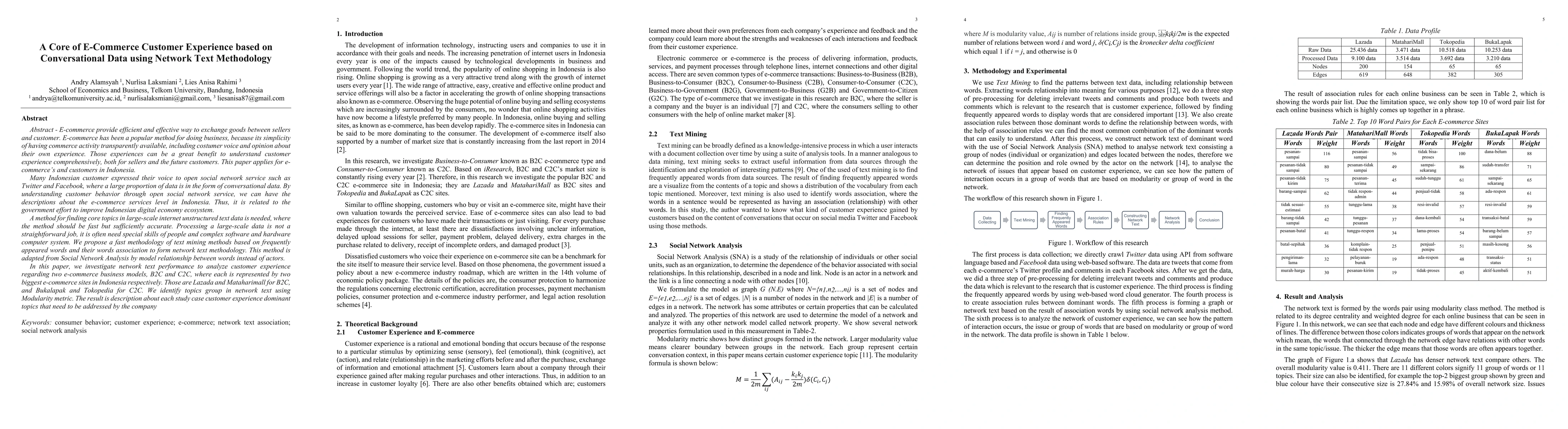 This paper proposes a network text methodology for analyzing conversational data from social networks to identify core topics in e-commerce customer experience in Indonesia. It aims to efficiently process large-scale unstructured text data to understand customer feedback and improve the digital economy ecosystem.