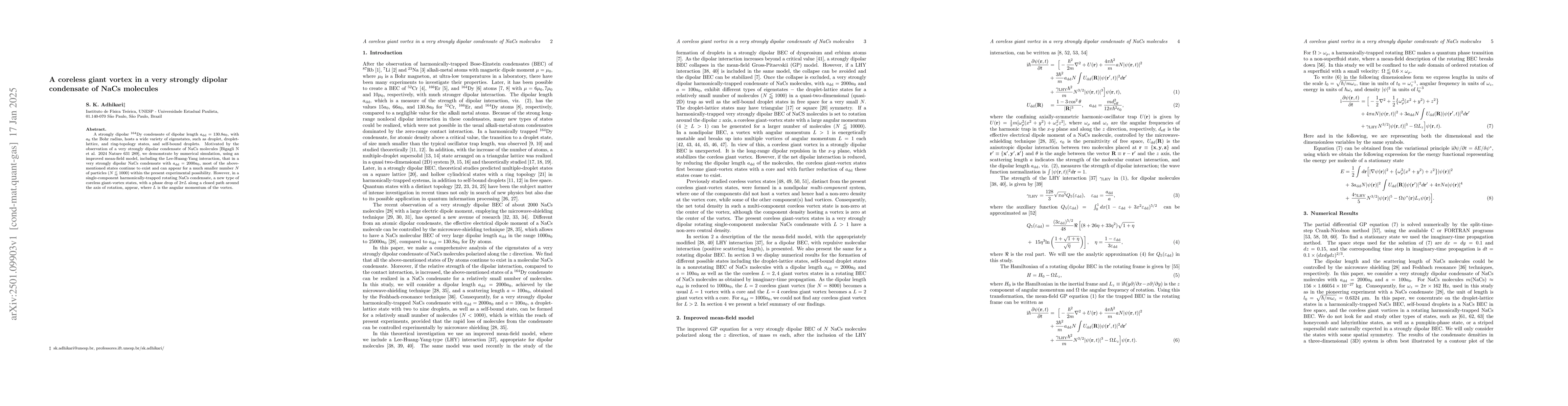 A strongly dipolar $^{164}$Dy condensate of dipolar length $a_{\mathrm{dd}}=130.8a_0$, with $a_0$ the Bohr radius, hosts a wide variety of eigenstates, such as droplet, droplet-lattice, and ring-topology states, and self-bound droplets. Motivated by the observation of a very strongly dipolar condensate of NaCs molecules [Bigagli N et al. 2024 Nature 631 289], we demonstrate by numerical simulation, using an improved mean-field model, including the Lee-Huang-Yang interaction, that in a very strongly dipolar NaCs condensate with $a_{\mathrm{dd}} = 2000a_0$, most of the above-mentioned states continue to exist and can appear for a much smaller number $N$ of particles ($N \lessapprox 1000$) within the present experimental possibility. However, in a single-component harmonically-trapped rotating NaCs condensate, a new type of coreless giant-vortex states, with a phase drop of $2 \pi L$ along a closed path around the axis of rotation, appear, where $L$ is the angular momentum of the vortex.