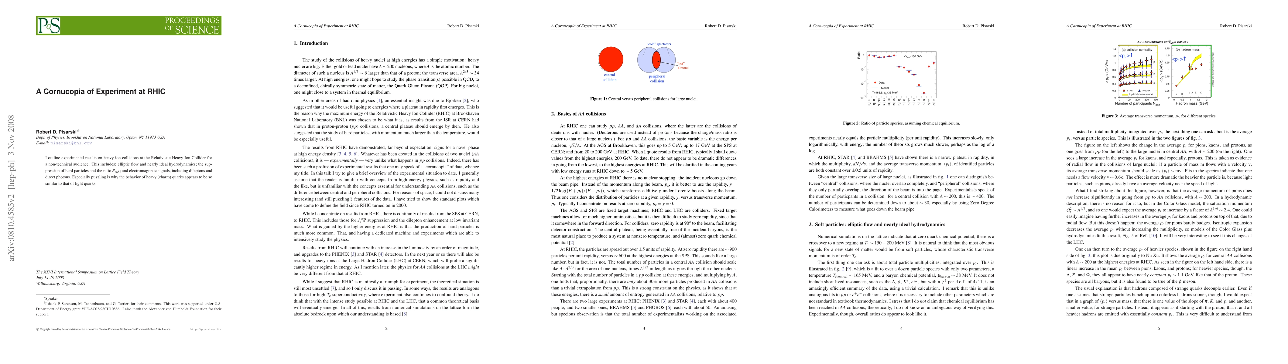 I outline experimental results on heavy ion collisions at the Relativistic Heavy Ion Collider for a non-technical audience. This includes: elliptic flow and nearly ideal hydrodynamics; the suppression of hard particles and the ratio R_AA; and electromagnetic signals, including dileptons and direct photons. Especially puzzling is why the behavior of heavy (charm) quarks appears to be so similar to that of light quarks.