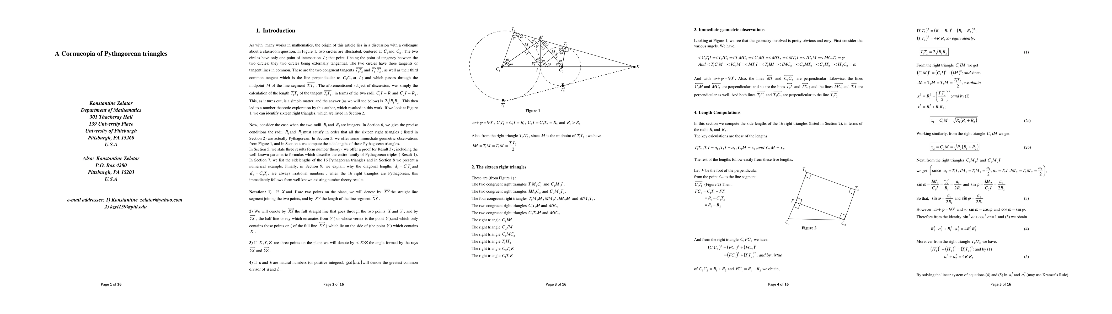 Consider two circles, externally tangential,and with integer radii R1, R2; and with R1>R2.The two circles have three tangent lines in common, one of them being T1T2. If M is the midpoint of T1T2, and K the point of intersection of the lines C1C2 and T1T2;then 16 right triangles are formed(C1 and C2 are the two circle centers), see Figure 1.In Section 6 of this paper, we find the precice form the two integers R1 and R2 must have, in order that the sixteen aforementioned right triangles be Pythagorean.