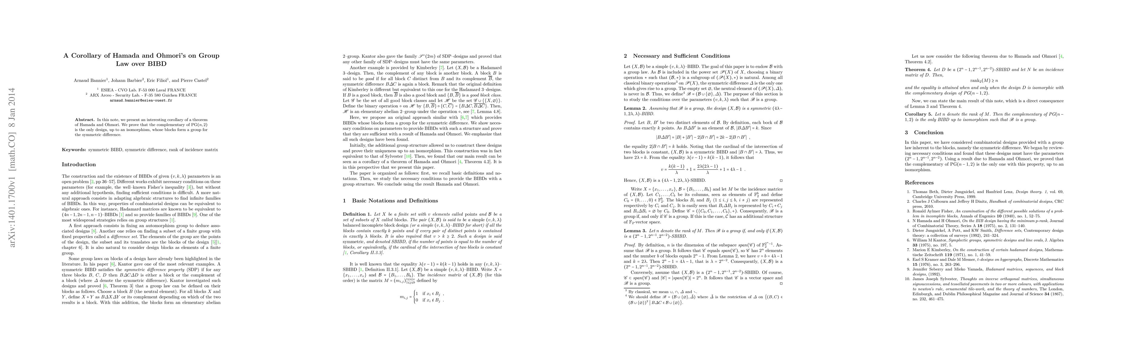 In this note, we present an interesting corollary of a theorem of Hamada and Ohmori. We prove that the complementary of PG(n,2) is the only design, up to an isomorphism, whose blocks form a group for the symmetric difference.