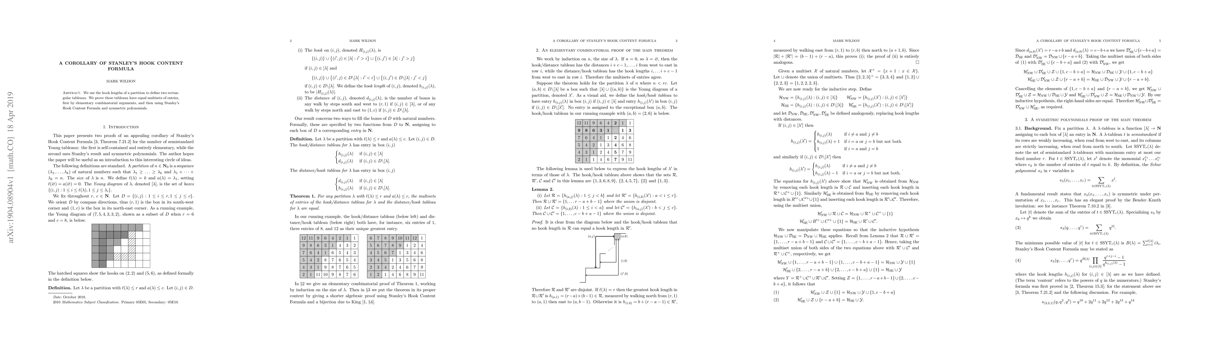 Summary: This paper establishes that two rectangular tableaux derived from partition hook lengths have identical multisets of entries, demonstrated through combinatorial arguments and utilizing Stanley's Hook Content Formula and symmetric polynomials.