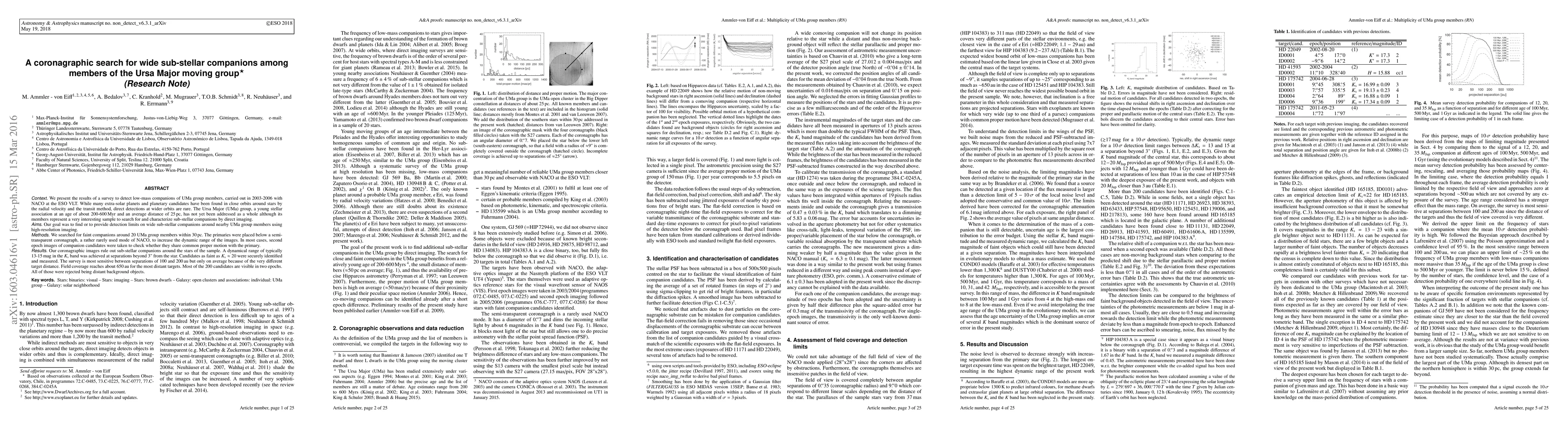 This study utilized high-resolution coronagraphic imaging with NACO at the ESO VLT to search for wide sub-stellar companions around 20 members of the Ursa Major moving group. The survey found no sub-stellar companions, achieving a detection limit of 13-15 mag in the Ks band at separations beyond 3".