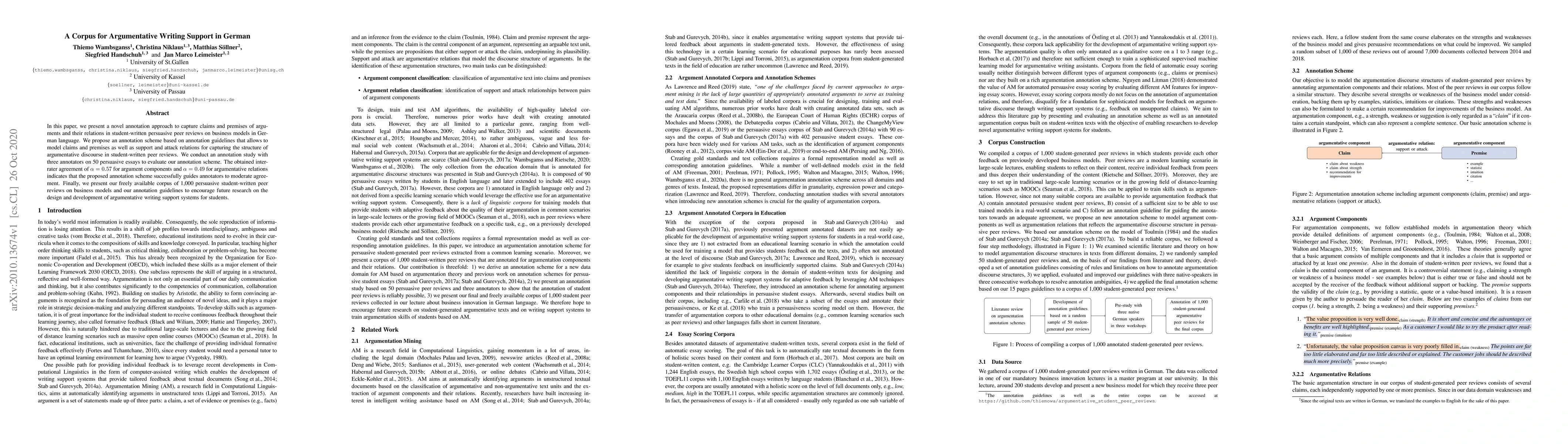 This paper introduces a new annotation scheme for capturing claims, premises, and their relations in German student-written persuasive essays, achieving moderate inter-rater agreement. It presents a freely available corpus of 1,000 annotated peer reviews to support future research on argumentative writing support systems.