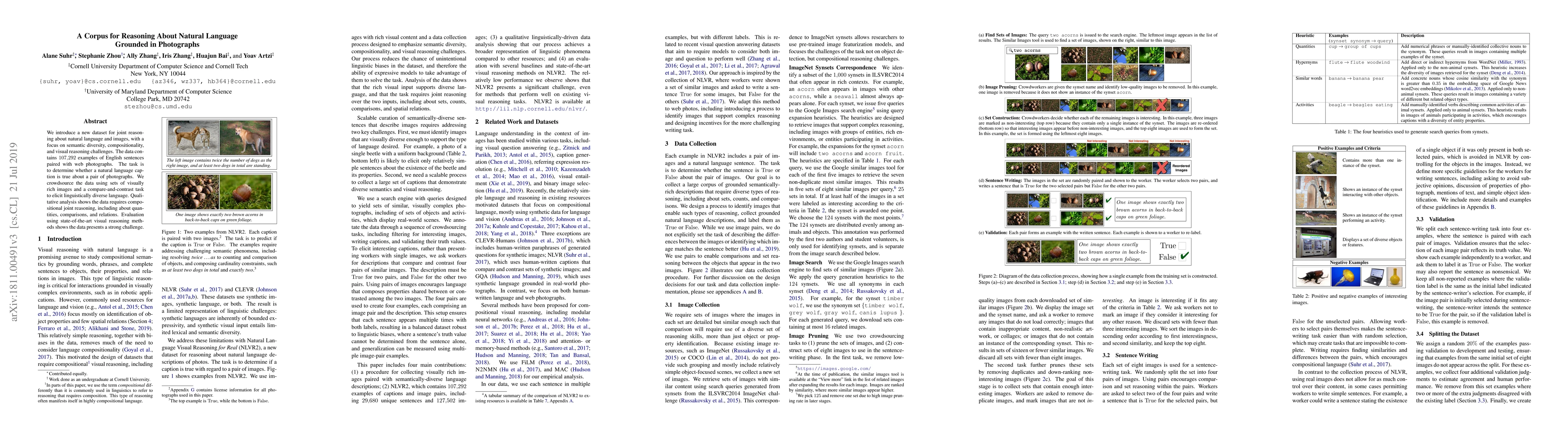 This paper introduces a new dataset pairing 107,292 English sentences with web photographs to test joint reasoning about natural language and images, focusing on semantic diversity and visual reasoning challenges. The dataset requires compositional reasoning about quantities, comparisons, and relations, and presents a significant challenge for state-of-the-art visual reasoning methods.