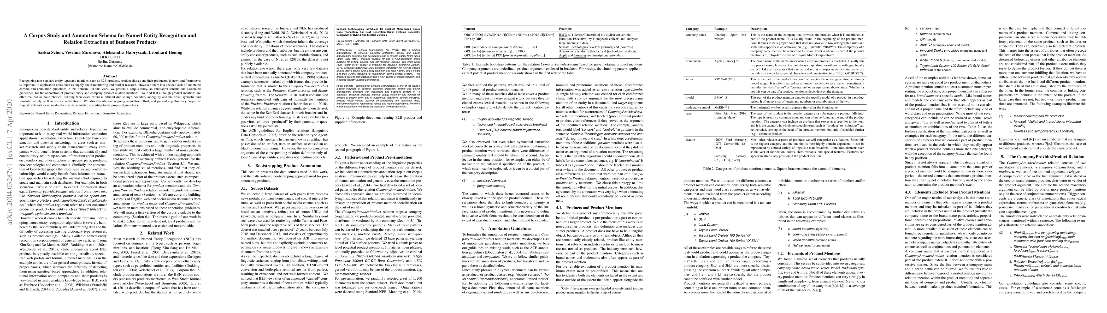This paper presents an annotation schema and guidelines for recognizing business product entities and their relations in news and social media texts, addressing the lack of annotated corpora in this domain. The study highlights the challenges in defining the extent of product mentions due to boundary ambiguity and syntactic-semantic variability.