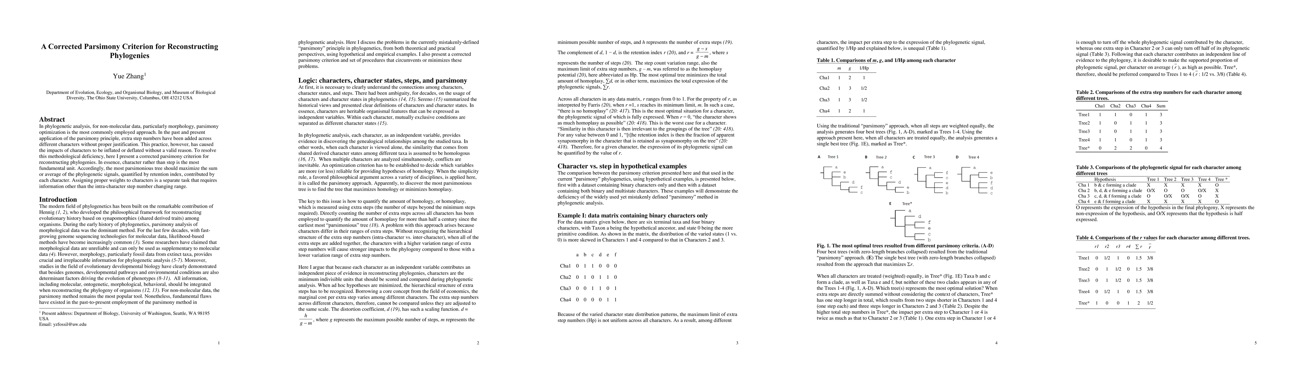 This paper proposes a revised parsimony criterion for reconstructing phylogenies, particularly for morphological data, to address the inflation or deflation of character impacts due to unjustified step number changes. The new criterion emphasizes the importance of character-based phylogenetic signals over step counts, advocating for maximizing the retention index contribution from each character.