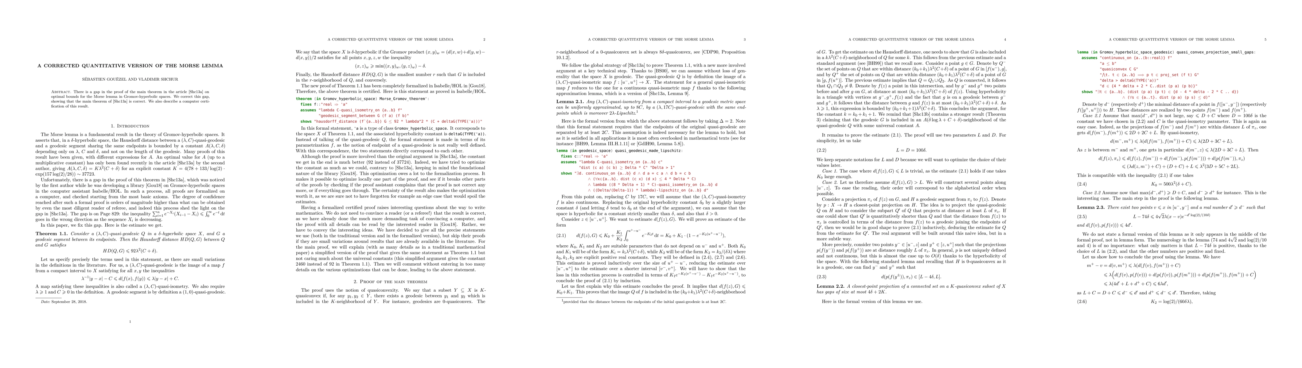 There is a gap in the proof of the main theorem in the article [ShCh13a] on optimal bounds for the Morse lemma in Gromov-hyperbolic spaces. We correct this gap, showing that the main theorem of [ShCh13a] is correct. We also describe a computer certification of this result.